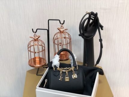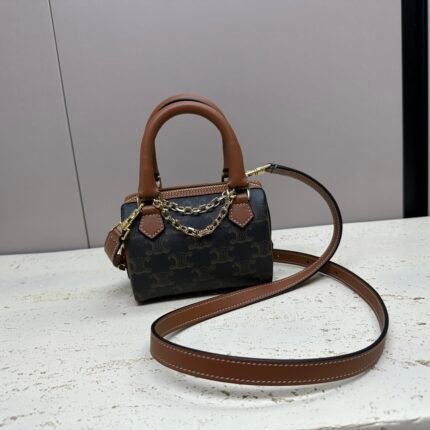 TRIOMPHE mini grained Boston bag. Material: grained cowhide leather, sheepskin leather lining, gold-tone metal parts, zipper lock closurenAdjustable detachable leather shoulder strap length 21 inches (53cm)nLeather tote length 3 inches (6.5cm)nChain wrap around handle, can be hung with attached pendant. nSize: 14cmX 9.5cmX 8cm (🔍195112)n650