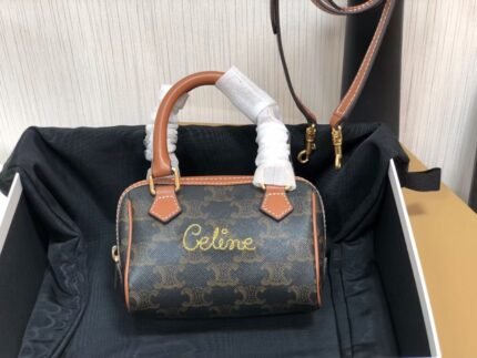 MiNi Pillow Bag please recognize the counter synchronized small charm 🌟 TRIOMPHE faux leather mini Boston bag n6 X 4 X 3 inches (14 X 9.5 X 8 cm) nTRIOMPHE CANVAS logo print, cowhide leather wrapped edges nFabric fabric lining 168058nGolden metal parts nZipper lock nAdjustable and detachable leather shoulder strap length 21 inches (53 cm)nLeather handles 3 inches (6.5 cm) longnChain wrap around handle for hanging attached pendant. number: 195112BZJ.04LU