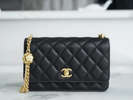 𝗖𝗛𝗔𝗡𝗘𝗟 23Spring/Summer New Camellia woc Black 🖤nn This season’s big breakout model , the classic woc bag shape with adjustable “Camellia” buckle, do old double C 𝗹𝗼𝗴𝗼 design, hardware with a simple plain gold chain, breaking the classic chain design, full of retro sense, classic and different ~ n nSize: 12.3×19.2×3.5cmn🔍: 23230890