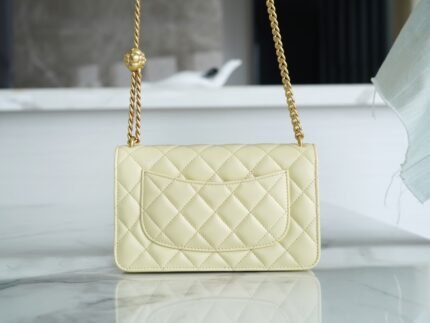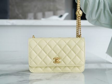 𝗖𝗛𝗔𝗡𝗘𝗟 23Spring/Summer New Camellia woc chick yellow nn This season’s big hit, the classic woc bag shape with adjustable “Camellia” buckle, do old double C 𝗹𝗼𝗴𝗼 design, hardware with a simple vegan gold chain, breaking the classic chain design, full of retro feeling, classic and different ~ n nSize: 12.3×19.2×3.5cmn🔍?23230890
