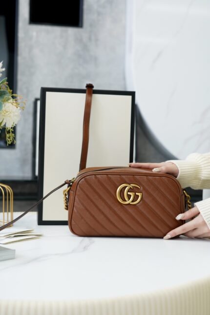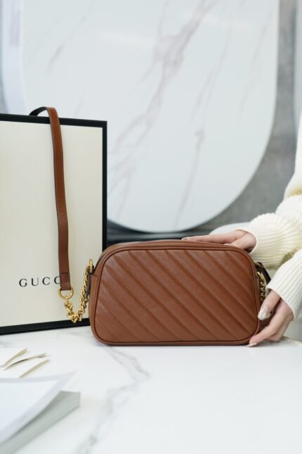 𝐆𝐆𝐌𝐚𝐫𝐦𝐨𝐧𝐭 Series Camera Bag 🍂 Caramel color n quite structured soft shape, top zipper closure with double G metal hardware. Leather shoulder pads with chain shoulder strap detailing greatly add to the comfort of wearing the bag. Twill quilted leather with double 𝐆 logo on the back, the overall shape of the soft but not too stiff nn camera bag series since its launch, has an intriguing fashion tone, have to avant-garde retro posture to present the simple temperament of the generous 〰〰n Dimensions: 24 * 13 * 7cm 🔍:4476320801