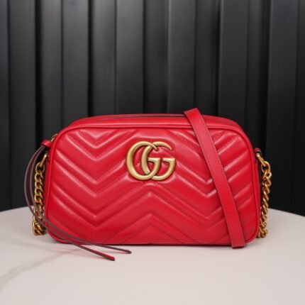 𝐆𝐆𝐌𝐚𝐫𝐦𝐨𝐧𝐭 Series Camera Bags Big Red n Quite Structured soft shape with top zipper closure with double G metal hardware. Leather shoulder pads with chain shoulder strap detailing for greatly increased wearing comfort. Wave pattern quilted leather with double 𝐆 logo on the back, the overall shape is soft but not too stiff nn camera bag series since its launch, has an intriguing fashion tone, have to avant-garde retro posture to present the simple temperament of the generous 〰〰n Dimensions: 24*13*7cm n🔍: 4476320880