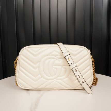𝐆𝐆 𝐌𝐚𝐫𝐦𝐨𝐧𝐭 Series Camera Bags White n rather Structured soft shape with top zipper closure with double G metal hardware. Leather shoulder pads with chain shoulder strap detailing for greatly increased wearing comfort. Wave pattern quilted leather with double 𝐆 logo on the back, the overall shape of the soft but not too stiff nn camera bag series since its launch, has an intriguing fashion tone, have to avant-garde retro posture to present the simple temperament of the generous 〰〰n Dimensions: 24*13*7cm n🔍: 4476320880