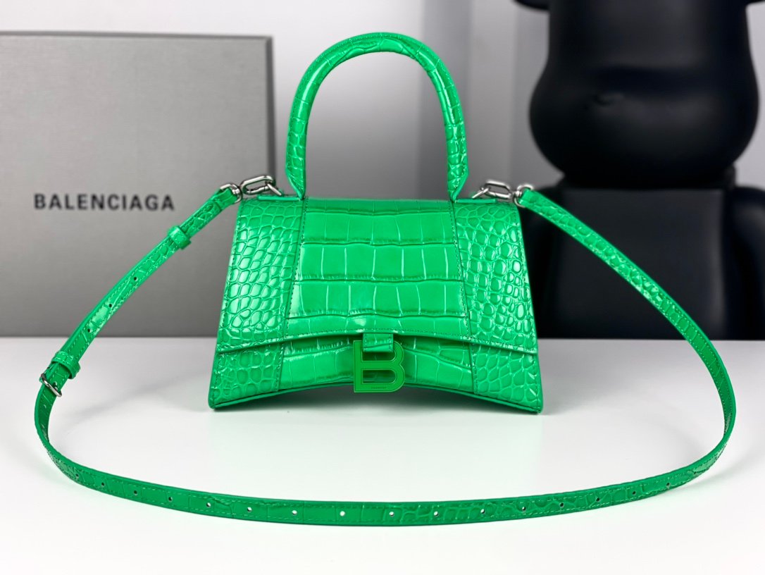 #𝗕𝗮𝗹𝗲𝗻𝗰𝗶𝗮𝗴 𝗮# Grass Green Green Buckle Crocodile Print n [Upgraded Original Leather Version] XS size – 1⃣️ 9⃣️cmn Original Leather Version 𝗛𝗼𝘂𝗿 𝗴𝗹𝗮𝘀𝘀 Hourglass bag New arrival! n🌟Made of original Italian cowhide leather, it feels great to the touch and shows off your taste at all times! n🌟 Imported bronze hardware! Super personalized B-shaped pull buckle, I give full marks to this design 💯, fashionable! Charming! n🌟 Unique iconic arc shape modeling is very recognizable, a glance makes people bright ah super cool! The appearance presents a round half-moon shape. n🌟 The inside of the bag is a large flat mouth, a zipper pocket inside, especially can be loaded! With lambskin lining, the loss is extremely high, the cost is extremely high! Do the best goods, waiting for the most knowledgeable you! n Model: 127 Crocodile Printnn XS size: 19x8x21cmn S size: 23x10x24cm