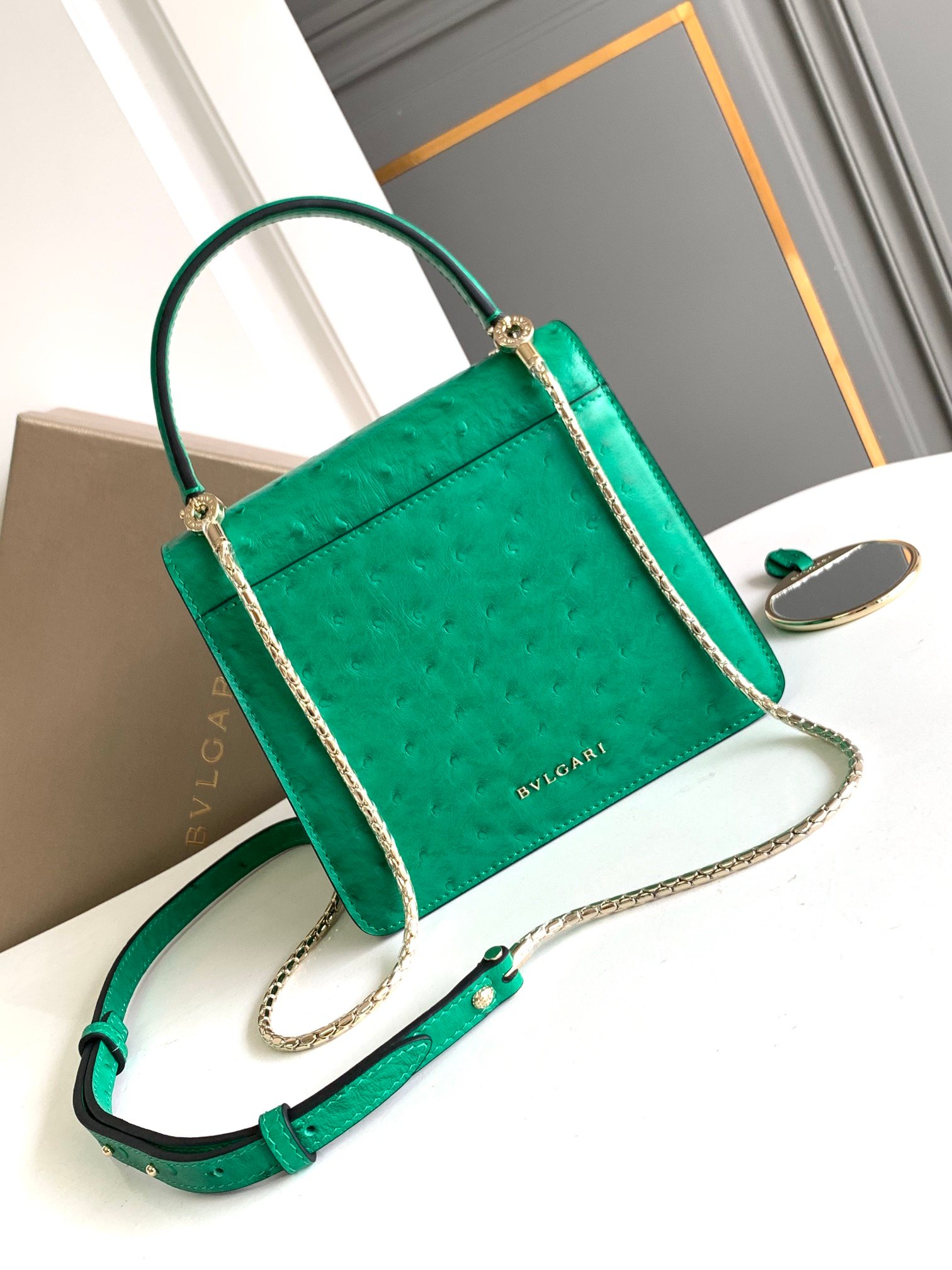 🔸 featuring three compartments, an exterior patch pocket on the back, an interior open pocket, a mirror pocket with personalized vanity mirror, and a back pocket decorated with BULGARI metal logo
