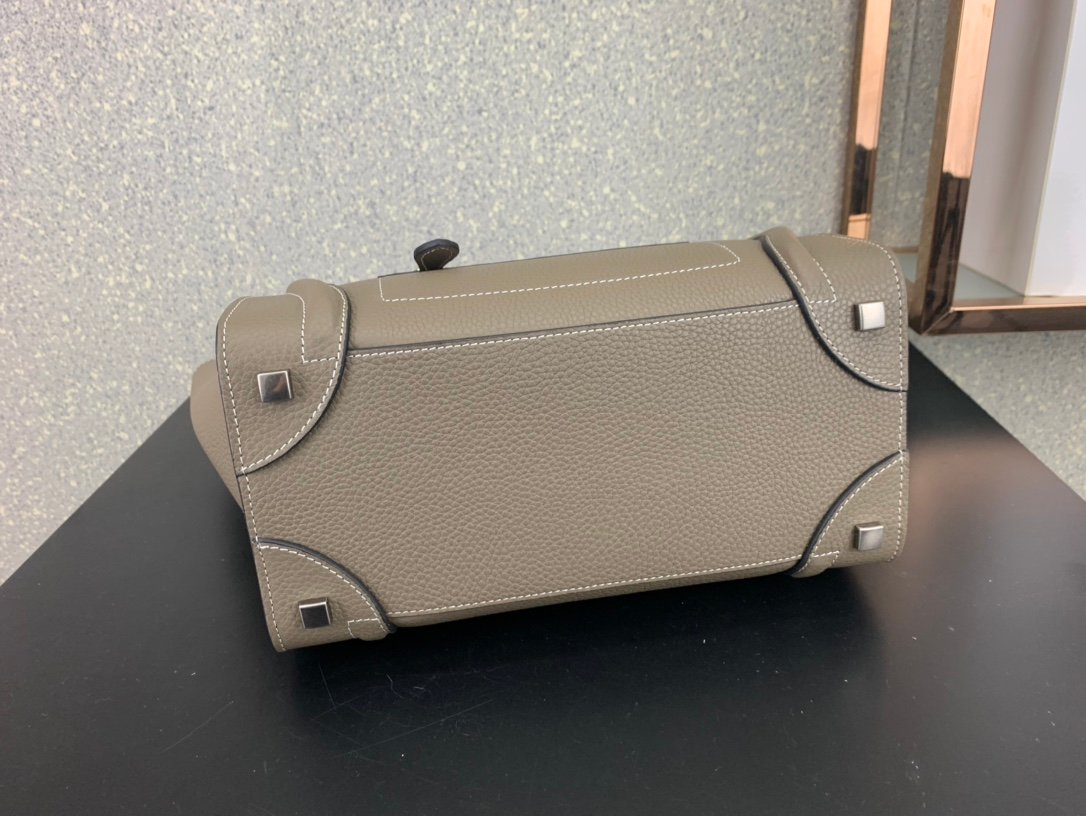 CELINE BELT MICRO MEDIUM GRAINED CALF LEATHER HANDBAGn9 X 8 X 5 INCHES (24 X 20 X 13 cm)n100% Calfskin Leathern100% Calfskin Leather LiningnGolden Metallic PiecesnMagnetic Snap Flap Locking Closure & Flap Under Zipper Locking ClosurenFlat Pocket InsidenFlat Pocket Outside on the BacknRemovable Leather Shoulder Strap L=20 INCHES (50 cm)n Handle length 4 inches (9 cm) n No. 175520p950n Elephant Grey