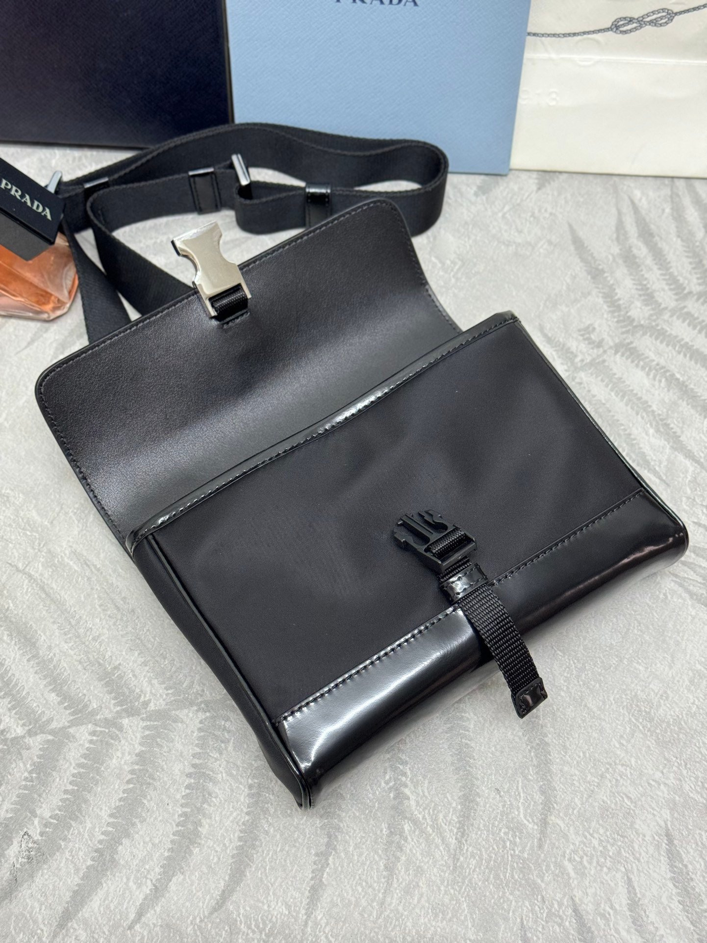 🎉 New men's diagonal cross bag 🎉 2VH168 🎉n The bag is made of plain weave cowhide, with a zipper closure and built-in pockets. It is equipped with adjustable nylon leather shoulder straps and delicate small bag hanging accessories. This minimalist leather shoulder bag exudes a modern atmosphere. A removable pouch and logo print Re-Nylon lining accent the refined lines. The front pocket makes for a very cool and casual lookn L16xH18.5xB5cm.