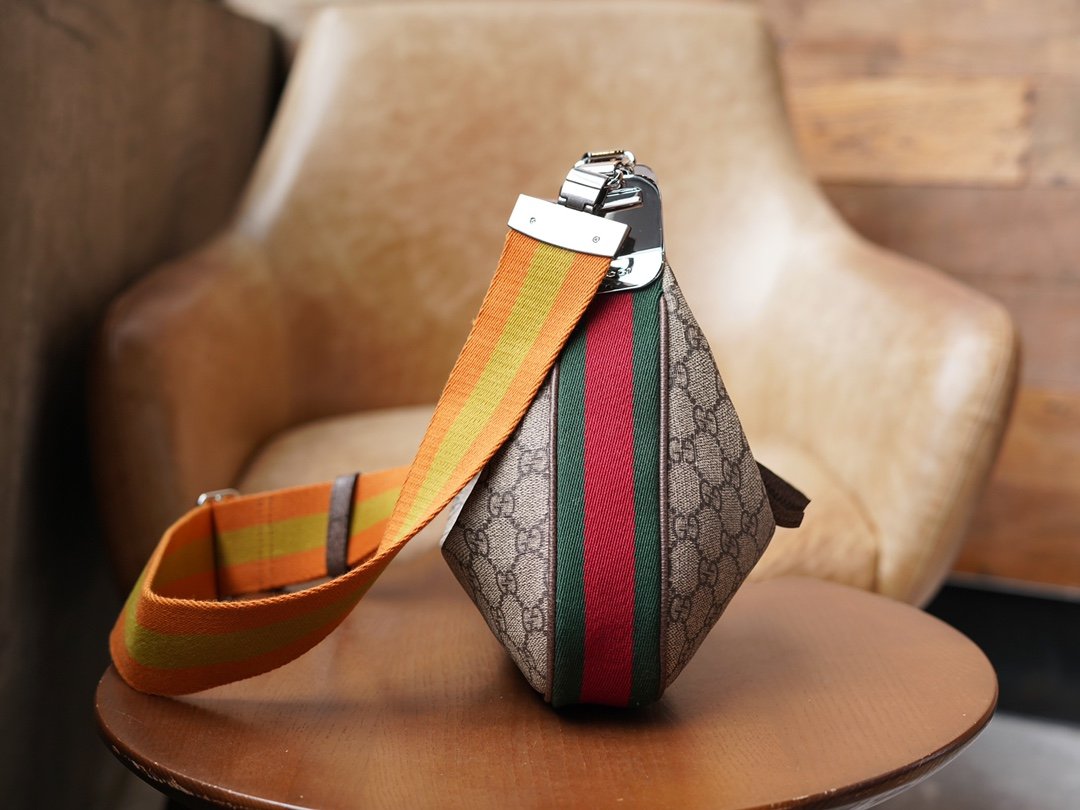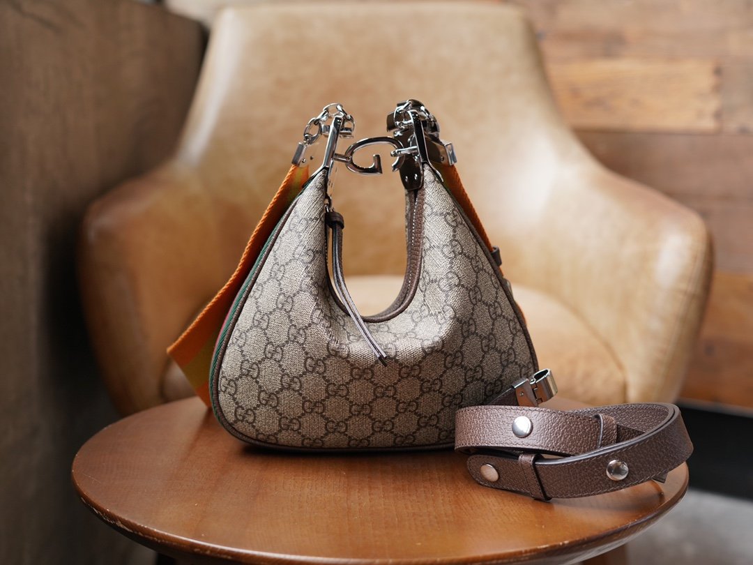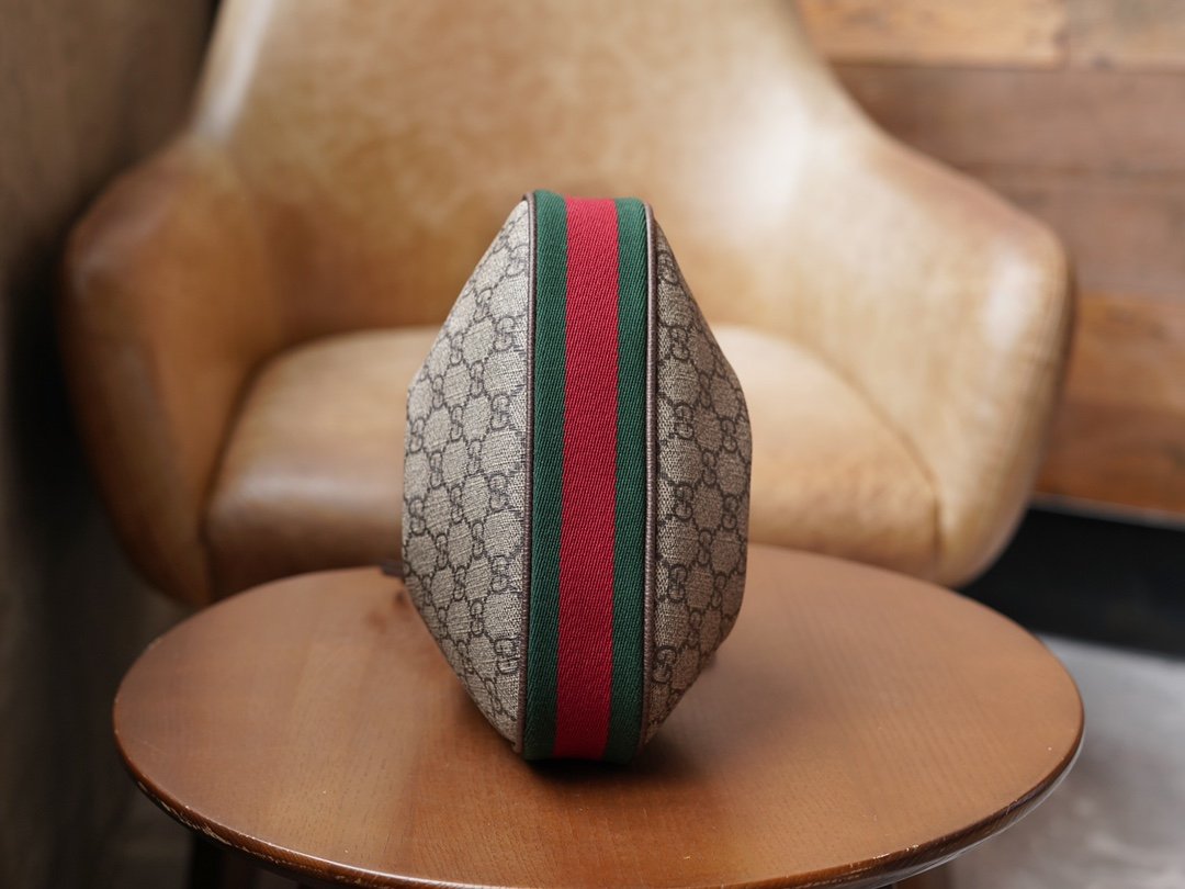 Refreshingly reinterpreted, this accessory is a nod to the timeless glamour of Hollywood. This accessory features a recognizable crescent moon shape and a G-hook closure for a unique design aesthetic. The combination of classic accessories and soft materials is a beautifully romantic take on vintage glamor. This small shoulder bag is made of beige and ebony GG Supreme canvas with red and green webbing piping.