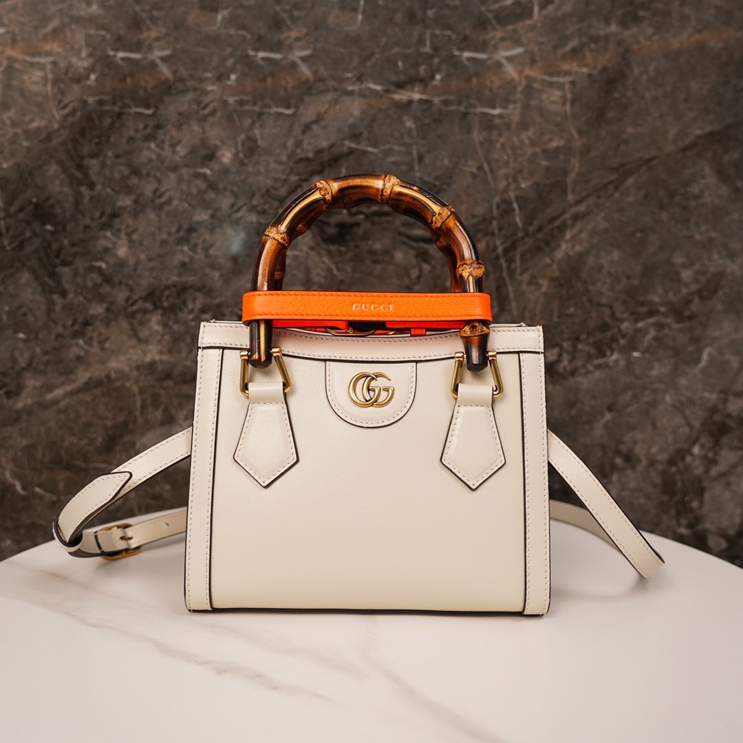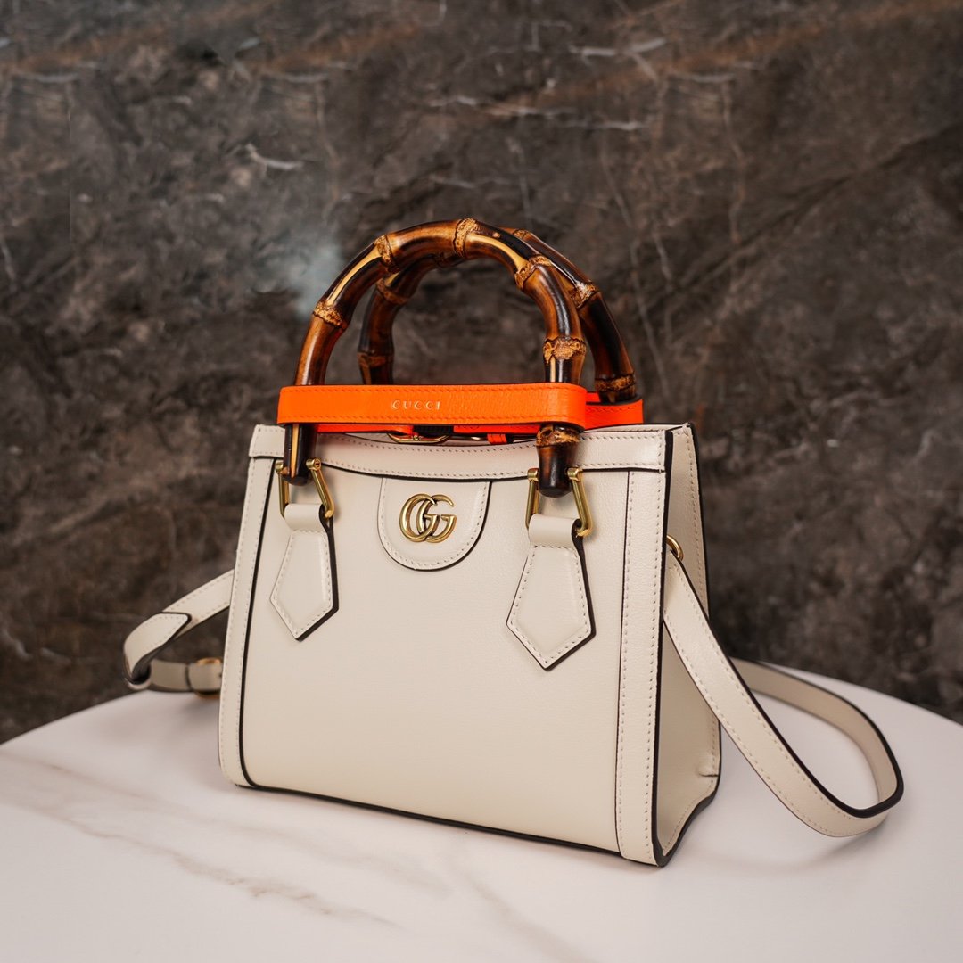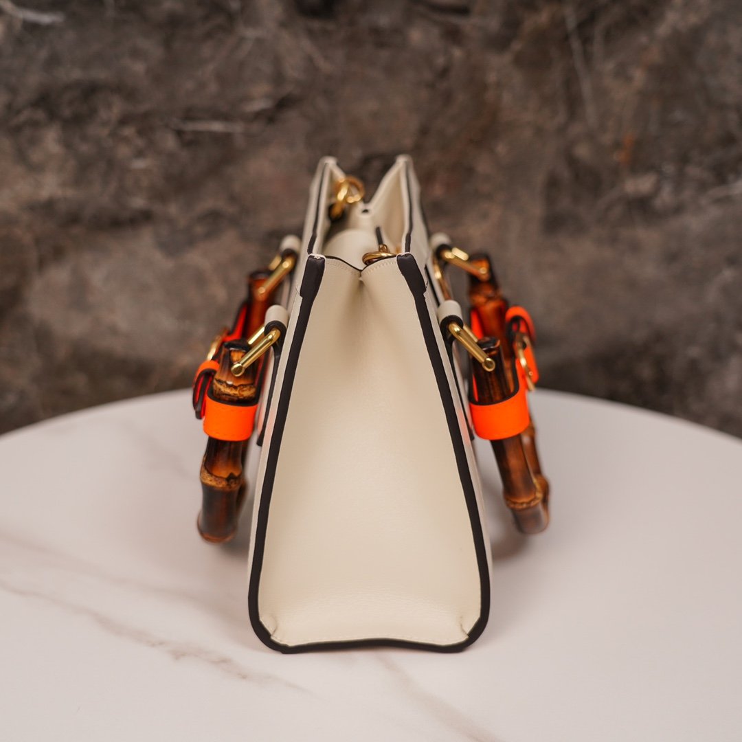 ๐ƒ๐ข๐š๐ง๐š Bamboo Collection Mini Tote Bag White nnThis mini tote bag combines two recognizable brand elements, the bamboo carry handle and the double G fitting. The white leather material and two neon colored buckle straps contrast with each other, highlighting the dynamic and elegant temperament. nSize: 20*16*10cmn๐Ÿ”: 6556610890