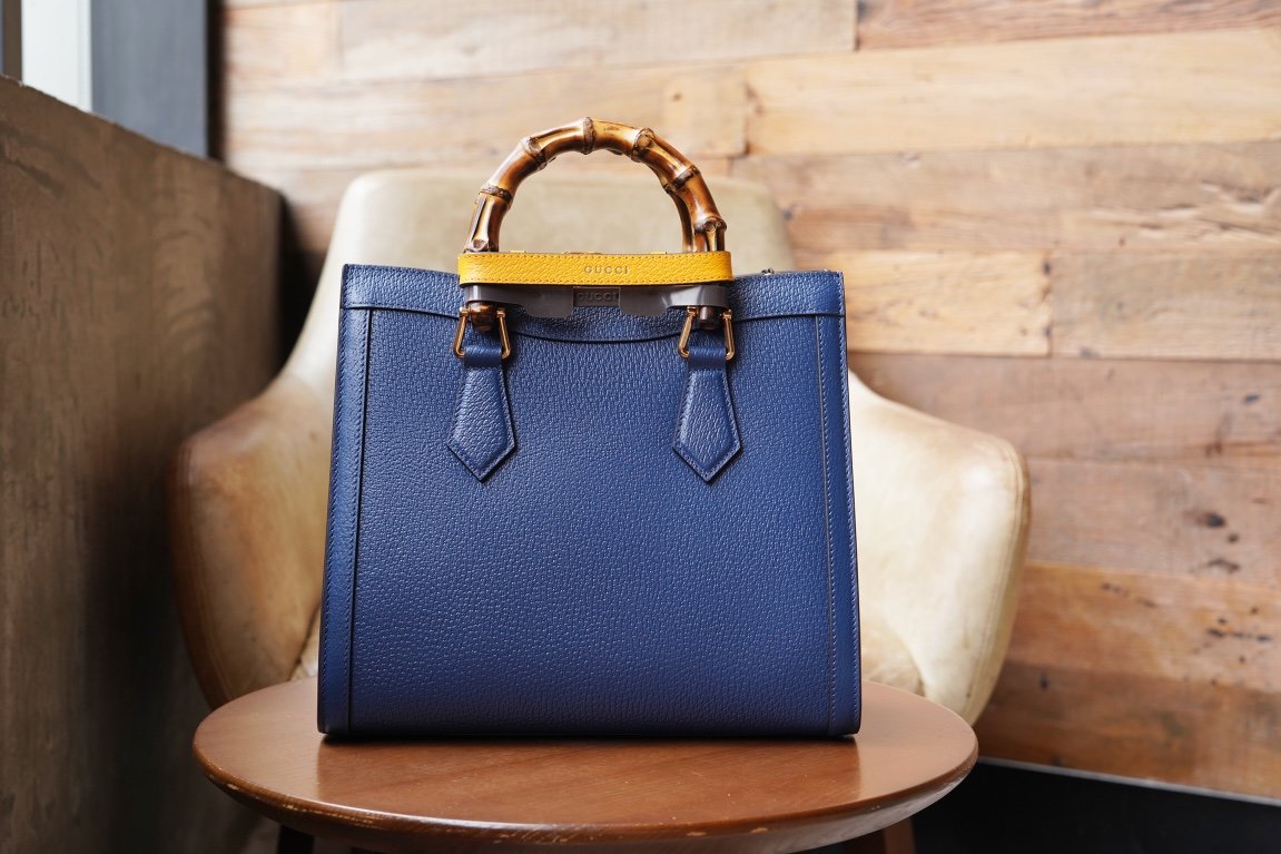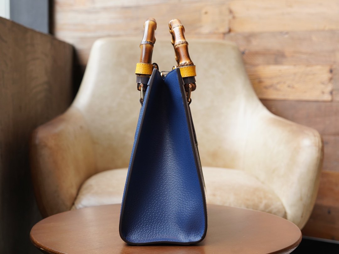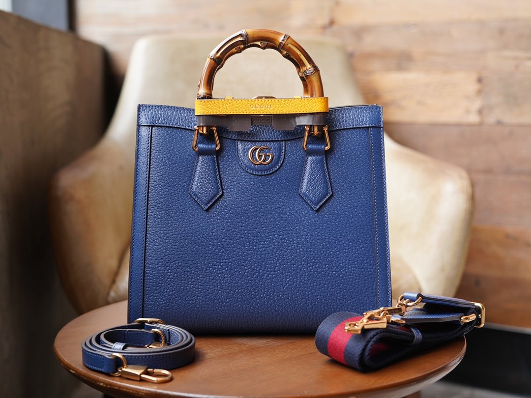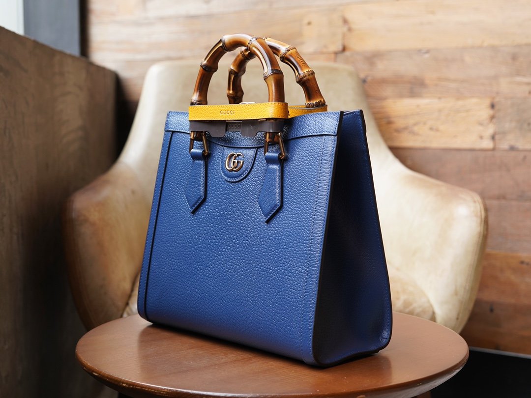 Diana Bamboo handbag combines two recognizable elements of the brand, the bamboo handles and the double G accessories. In this small tote bag, the blue leather is contrasted with two neon colored buckled straps that accentuate the dynamic elegance of the bag. The decorative carry handle buckle strap is inspired by the plasticized buckle straps used in the production process.