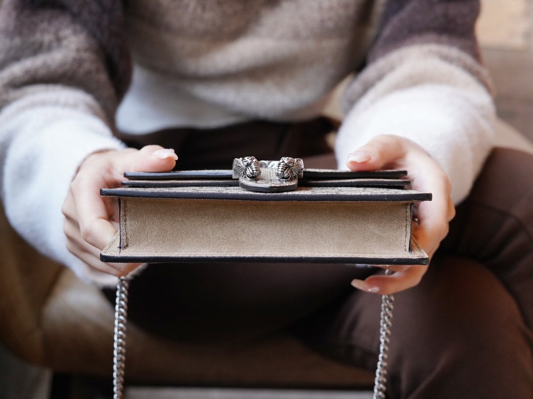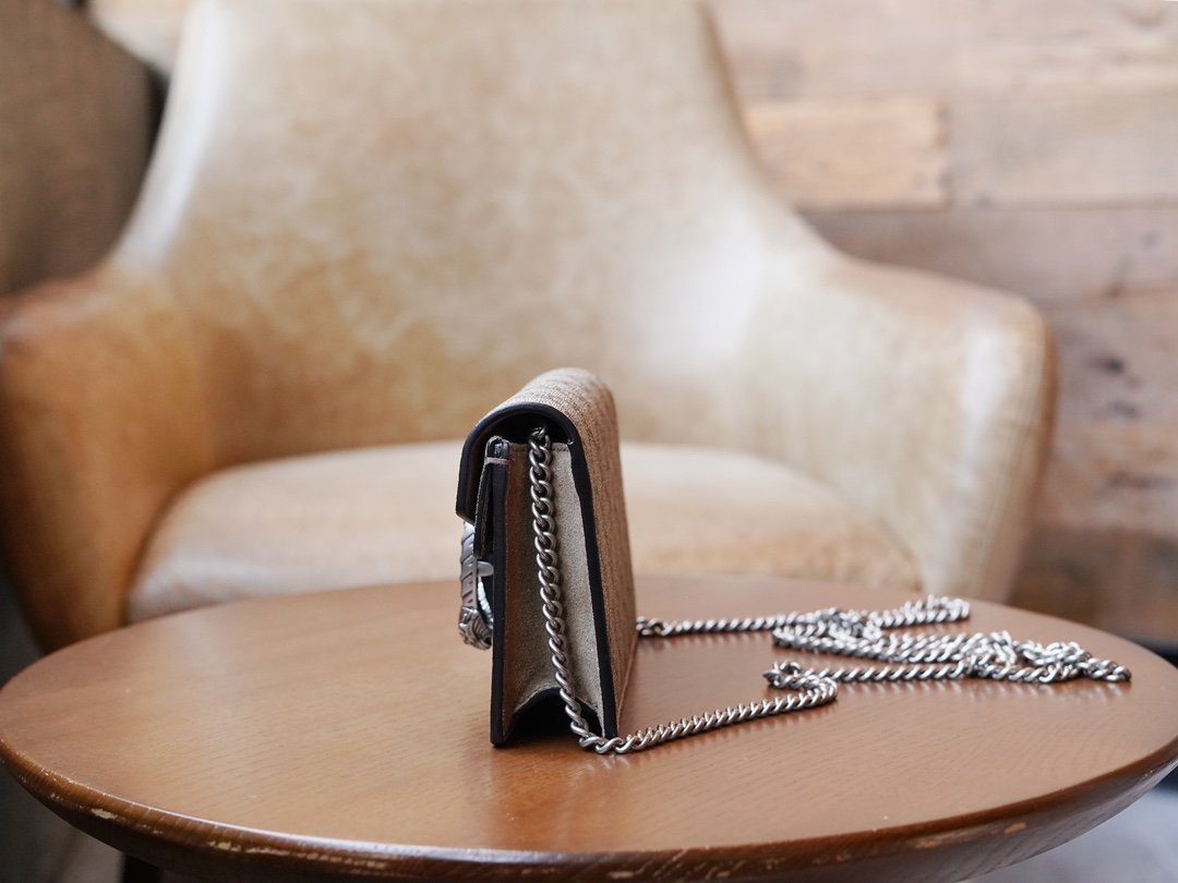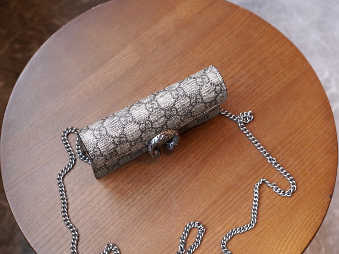 Quite a structure! The structured GG Supreme canvas chain super mini bag is fitted with a keychain that can be used to attach the bag to another larger bag. The closure is finished with a woven double tiger head clasp – a detail inspired by the Greek god Dionysus (Dionysus series), who mythologically rode across the Tigris on a tiger sent by Zeus.