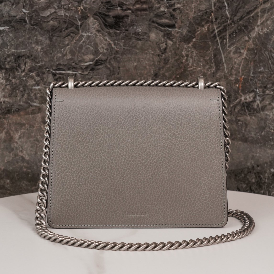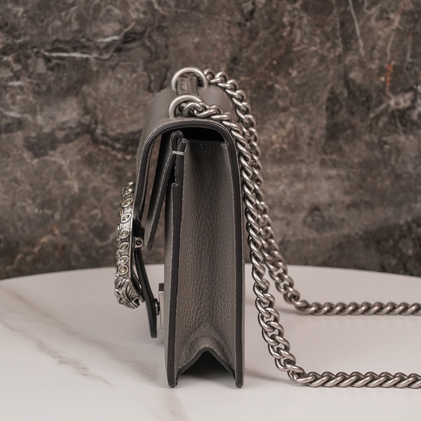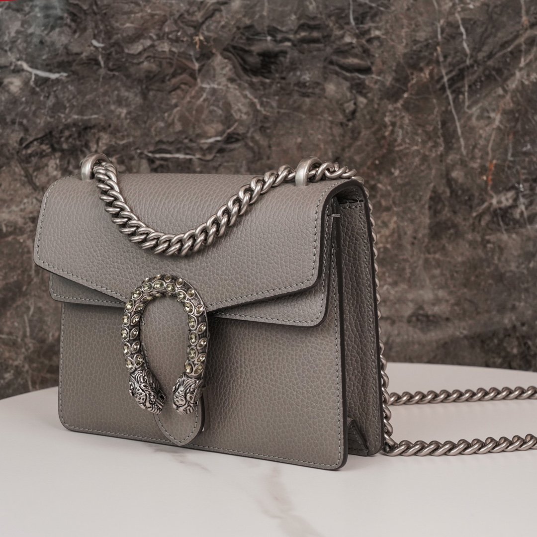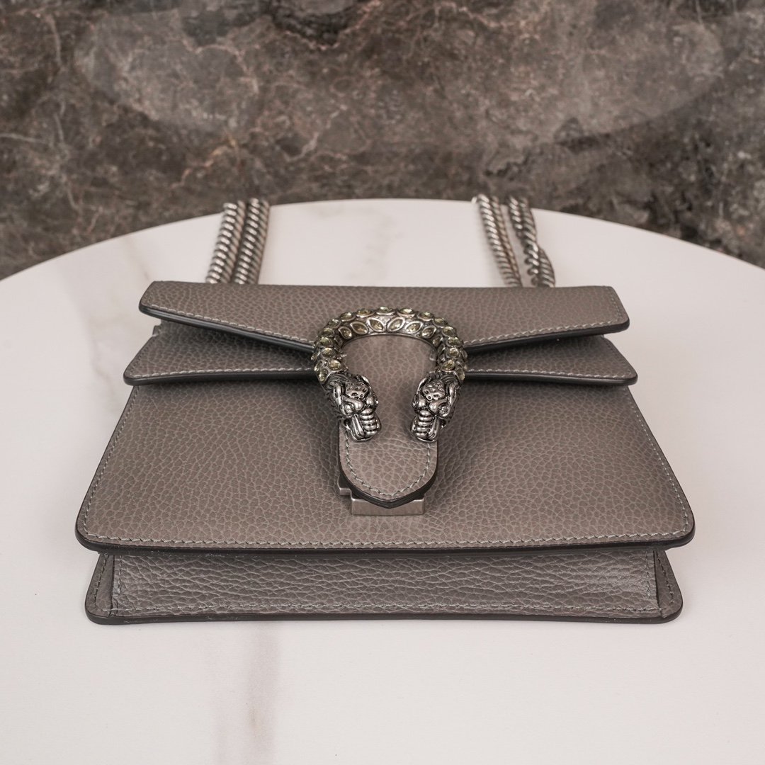 𝐃𝐢𝐨𝐧𝐲𝐬𝐮𝐬 Collection Leather Mini Handbag Gray nnThis Dionysus Collection This shoulder bag from the Dionysus collection is styled in a chic earthy gray leather for the Early Spring 2020 collection. The buckle is embellished with the collection’s signature woven tiger head detail, inspired by Dionysus, one of the Greek gods who, in mythology, crossed the Tigris River on a tiger sent by Zeus. The sparkling crystal inlay gives the buckle a dazzling fashion style. nSize: 20*15.5*5cmn🔍: 4219700501