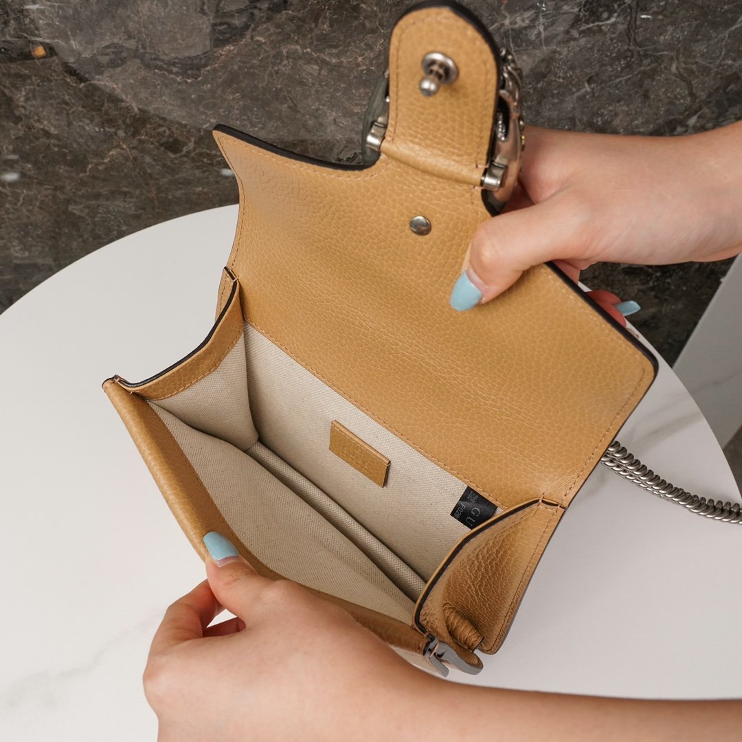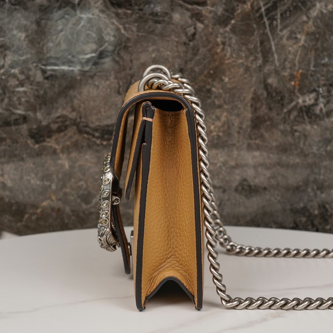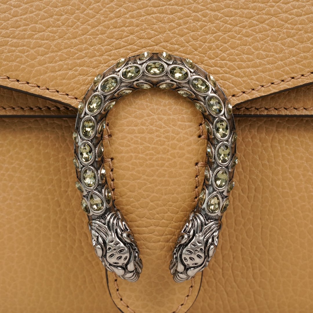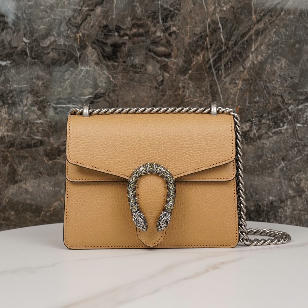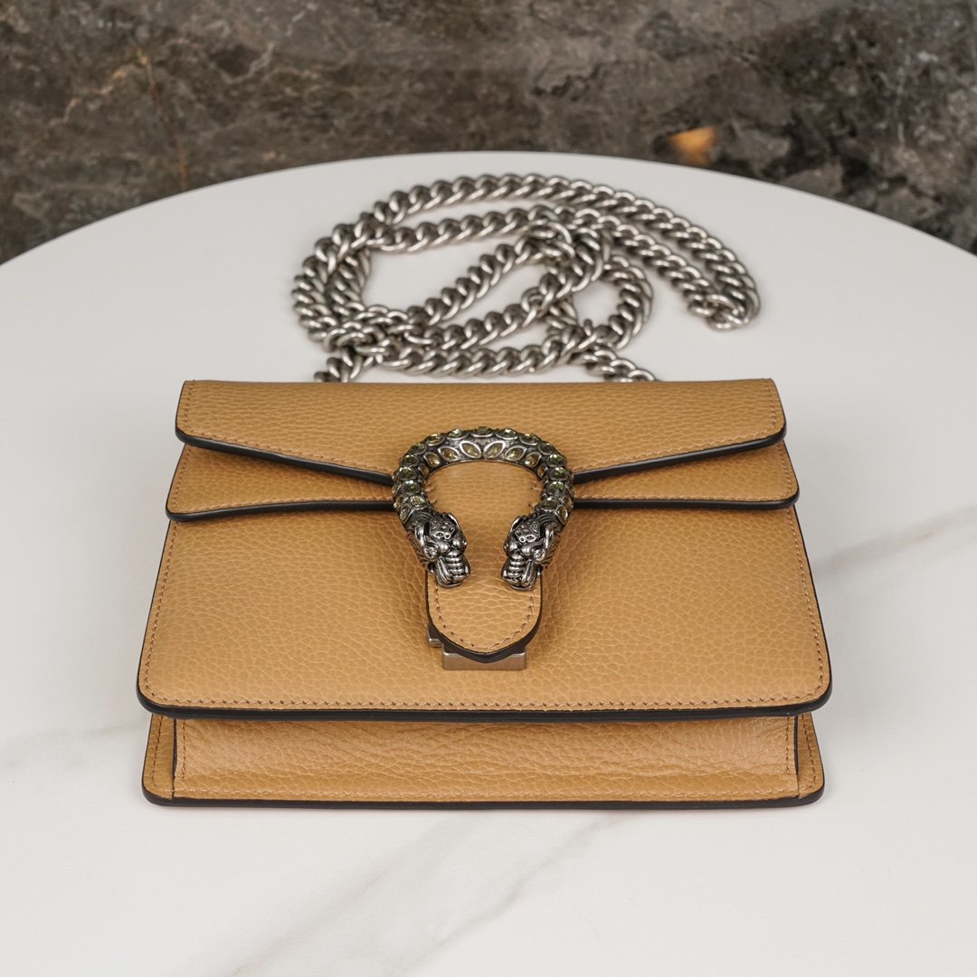 𝐃𝐢𝐨𝐧𝐲𝐬𝐮𝐬 Collection Leather Mini Handbags Brown nEpilogue collection aims to break through the boundaries of the inherent rules of fashion. The Epilogue collection aims to break through the rules of fashion and convey the idea that items should not be in fashion for just one season, but rather, they should remain fresh and new with the passage of time. The looks in the collection bring together iconic designs and motifs from Creative Director Alexandra Micheli over the past five years.nThis Dionysus collection handbag is adorned with the iconic woven tiger head closure and is crafted in brown leather, adorned with a locking clasp studded with sparkling crystals for an upgraded grunge look. nSize: 20*15.5*5cmn🔍: 4219700501