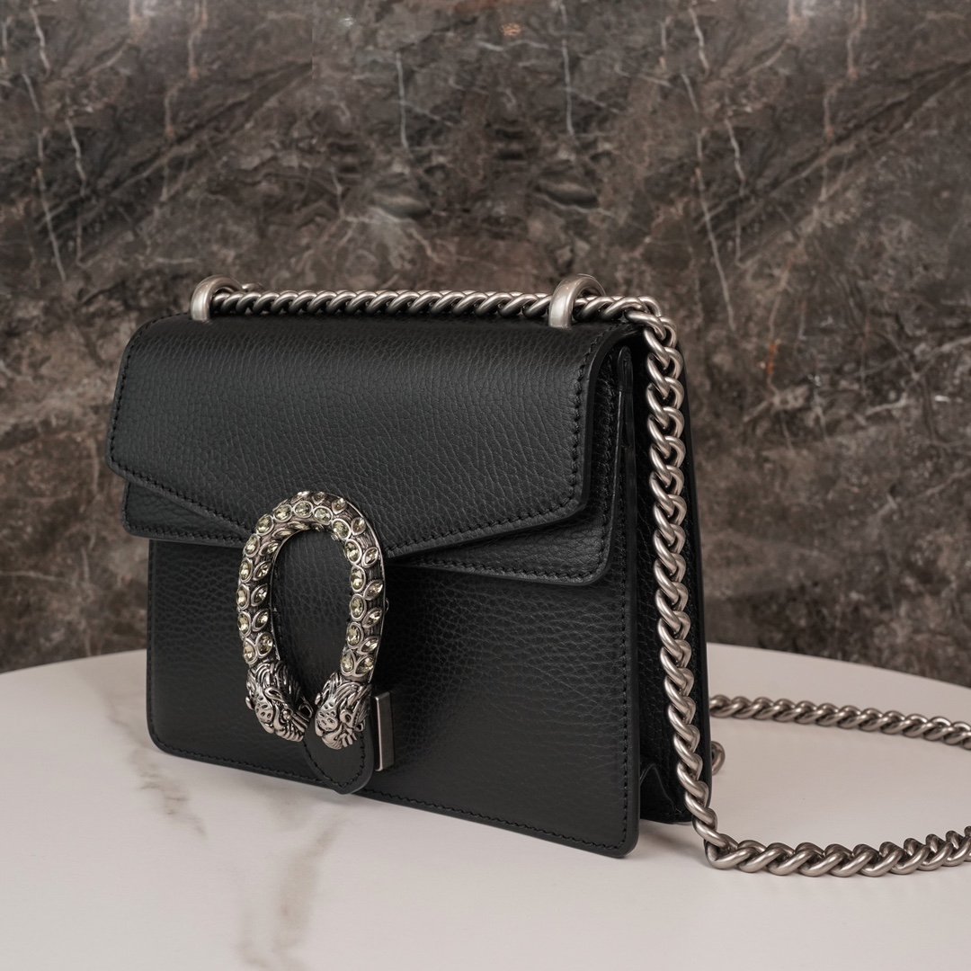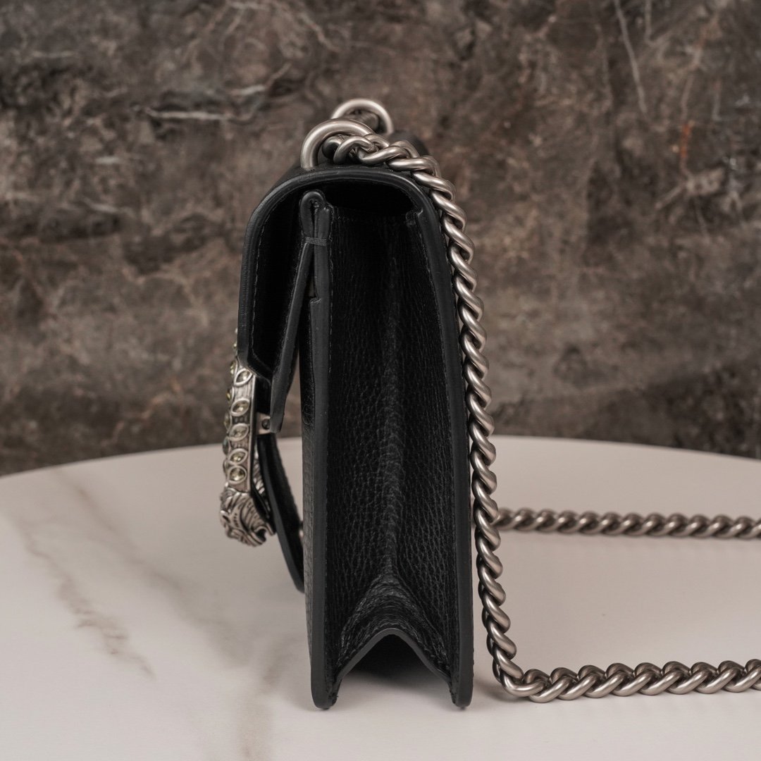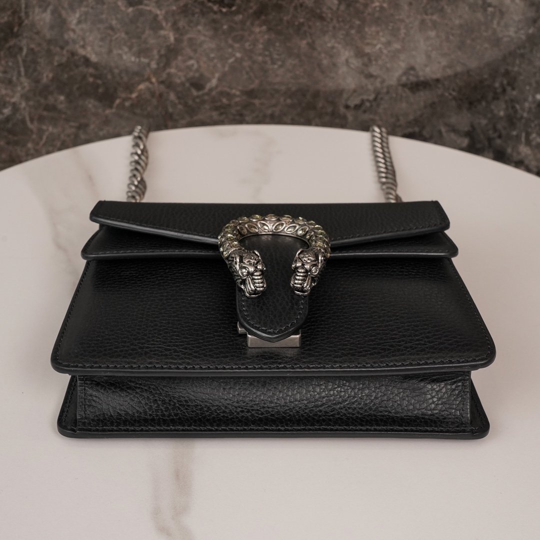 Dionysus Collection. With the now iconic tiger’s head clasp – a detail inspired by the Greek god Dionysus (Dionysus collection), who in mythology rode across the Tigris on a tiger sent by Zeus. The clasp is also decorated with black Swarovski crystals. The sliding chain bag comes with a variety of carrying styles, allowing it to transition between shoulder and hand carry. Exquisitely crafted from sturdy and durable woven leather.