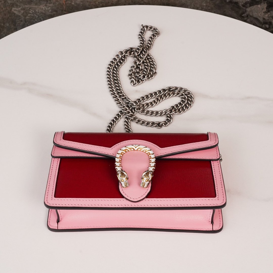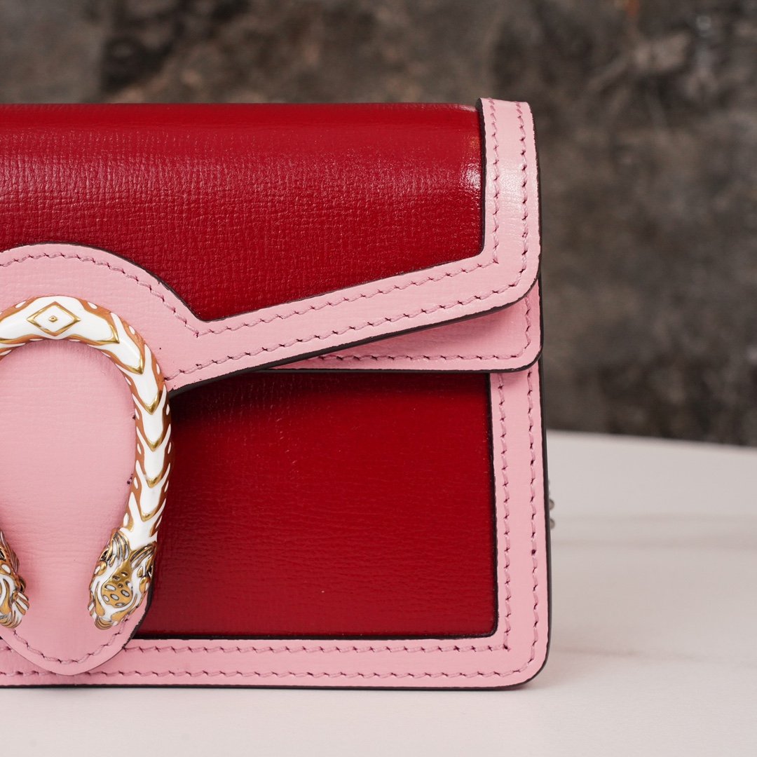 Home BAGS GUCCI ๐ƒ๐ข๐จ๐ง๐ฒ๐ฌ๐ฎ๐ฌ collection of ultra-miniature handbags Red and Pink nn Classic styles revitalized by a vibrant and bright color palette. The classic red and pink color scheme has been reinterpreted in a bright and vibrant color palette, reminiscent of the beauty of precious stones. The Dionysus bag is crafted in new ruby red leather with pale pink piping. The collection’s iconic tiger head closure incorporates glittering enamel details to emphasize the exceptional design quality. nSize: 16.5*10*4cmn๐Ÿ”: 4764320860