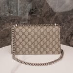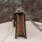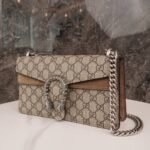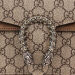 decorated with classic 𝐆𝐆 pattern and brown suede piping detail. The bag is embellished with the brand’s signature tiger head clasp, inspired by Dionysus, the Greek god of wine, who in myth and legend rode a tiger sent by Zeus across the Tigris River, and sparkling crystals that give the clasp an air of luxury. The sliding chain strap creates a variety of carrying styles, which can be freely converted between a shoulder bag and a handbag.