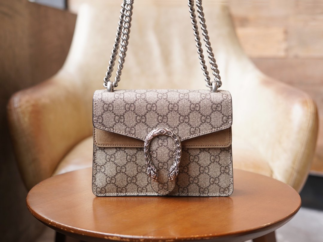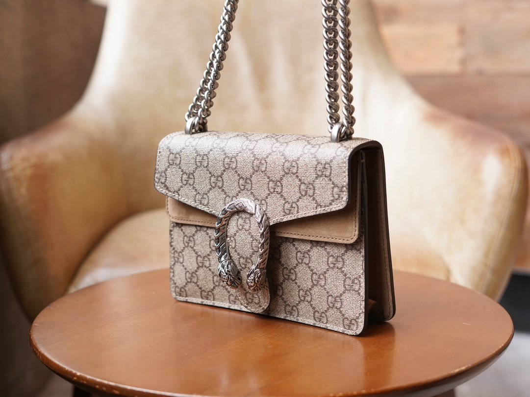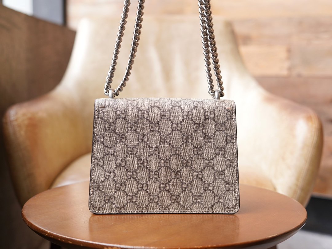 Home BAGS GUCCI 𝐃𝐢𝐨𝐧𝐲𝐬𝐮𝐬 Collection Wine God Canvas Shoulder Bag Brown nn Quite a structured mini bag. With woven double tiger head clasp. The sliding chain bag comes with a variety of carrying styles, which can be freely converted between shoulder and hand carry. nSize: 20*15.5*5cmnModel No.: 421970