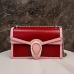 Classic styles are revitalized with vibrant and bright colorways. The classic Dionysus model has been reinterpreted in a bright and vibrant color palette, reminiscent of the beauty of precious stones. This Dionysus bag is crafted from ruby red leather and features the iconic tiger head closure in gold tone. Textured hardware and glittering enamel details emphasize the brand’s elegant and uncomplicated design style.