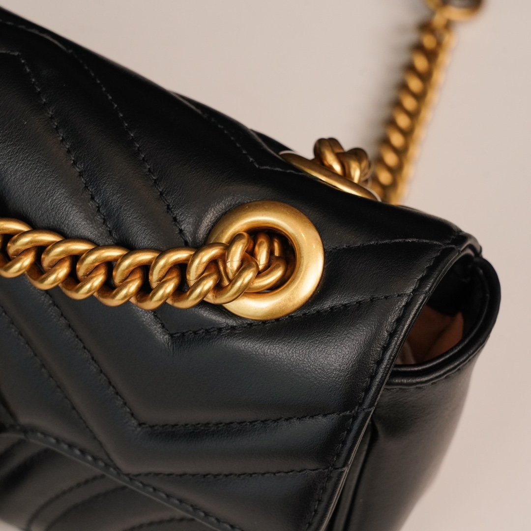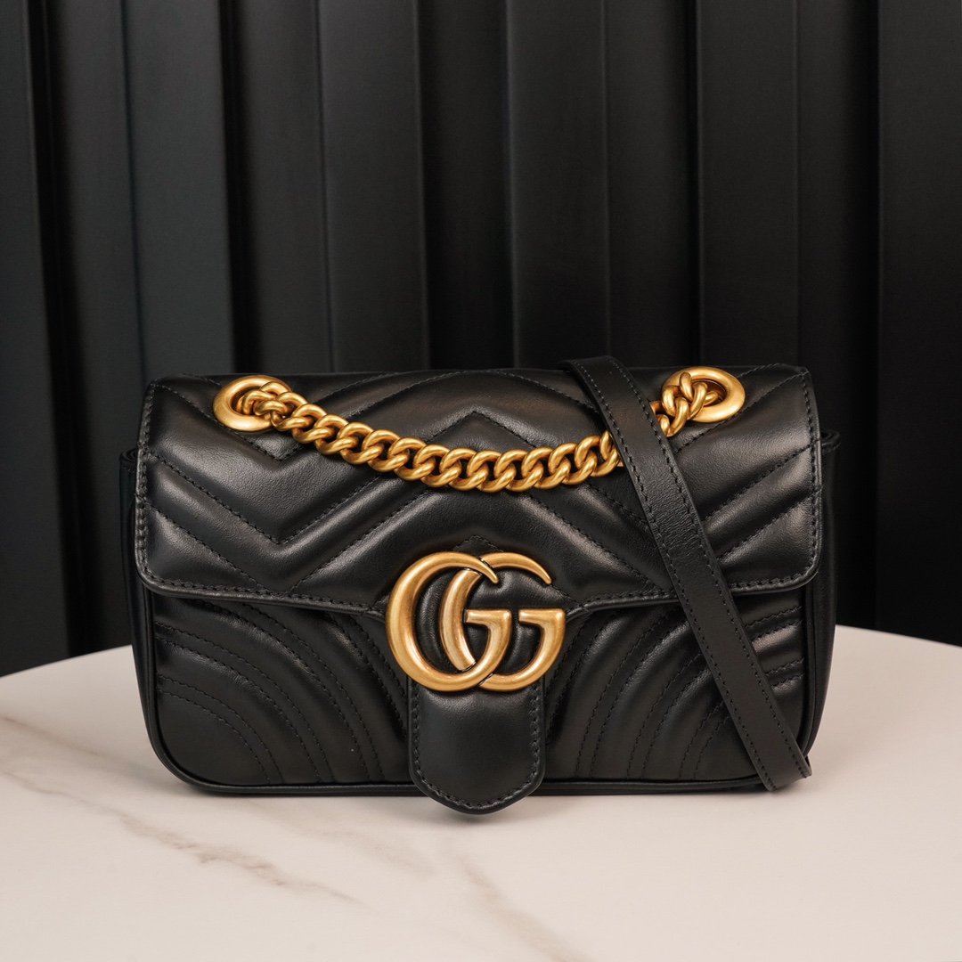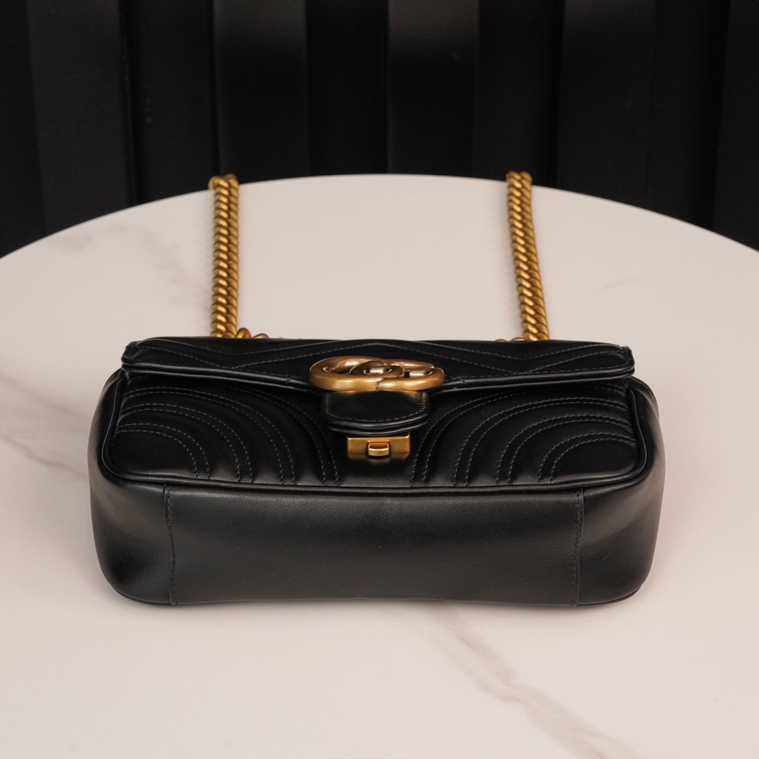 Home BAGS GUCCI 𝐆𝐆𝐌𝐚𝐫𝐦𝐨𝐧𝐭 Black Small nn Structured The soft shape and oversized flap closure, recognizable double 𝐆 accessories give the bag more charm 〰n the sliding chain shoulder strap has a variety of ways to carry, can be freely converted between shoulder and hand ❏n quilted 𝐕 type leather, the back of the decorated with a heart pattern n Simple shape, large capacity beyond imagination, and classic but not outdated design, the future of the chic degree of full completion depends on it! nSize: 22*13*6cmn🔍: 4467440880