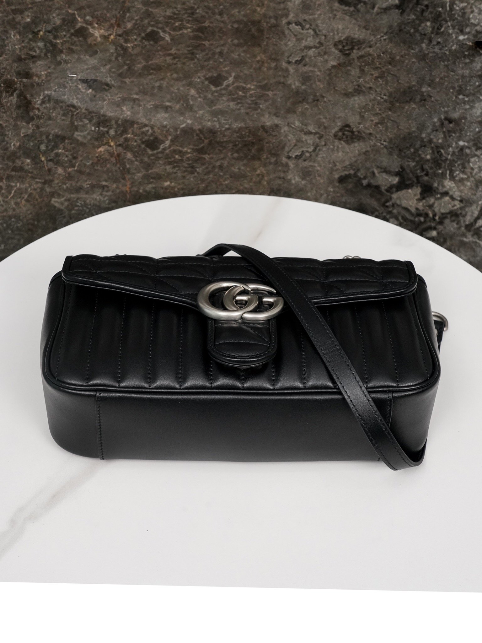 The Aria – Fashion Aria” collection continues to boldly explore the brand’s classic symbolic elements. As part of the Favored Handbags Selection, the GG Marmont collection is revered for its signature quilted leather and double G monogrammed interwoven accessories. On this small shoulder bag, the classic material is incorporated with vertical and twill patterns to create a distinctive geometric style design.