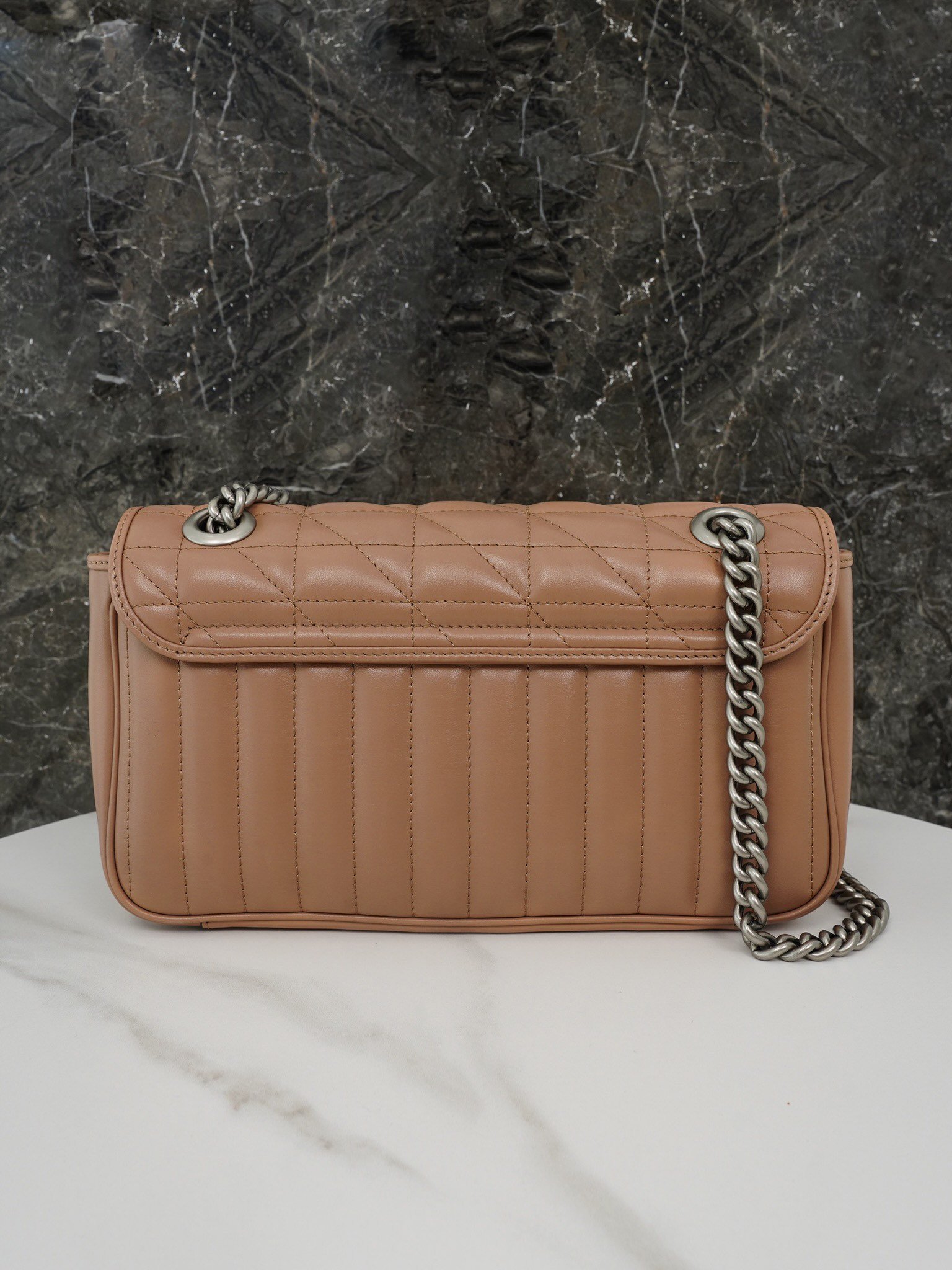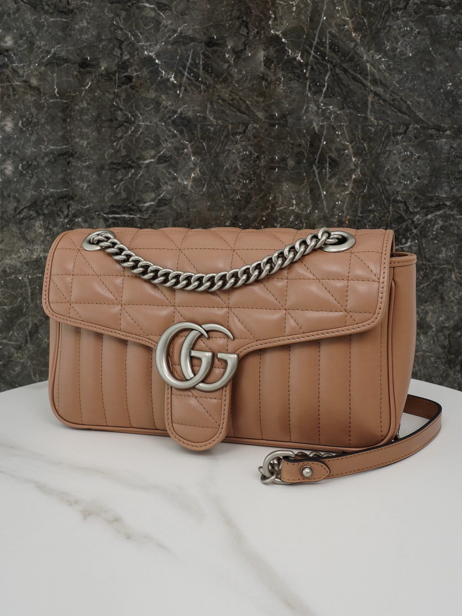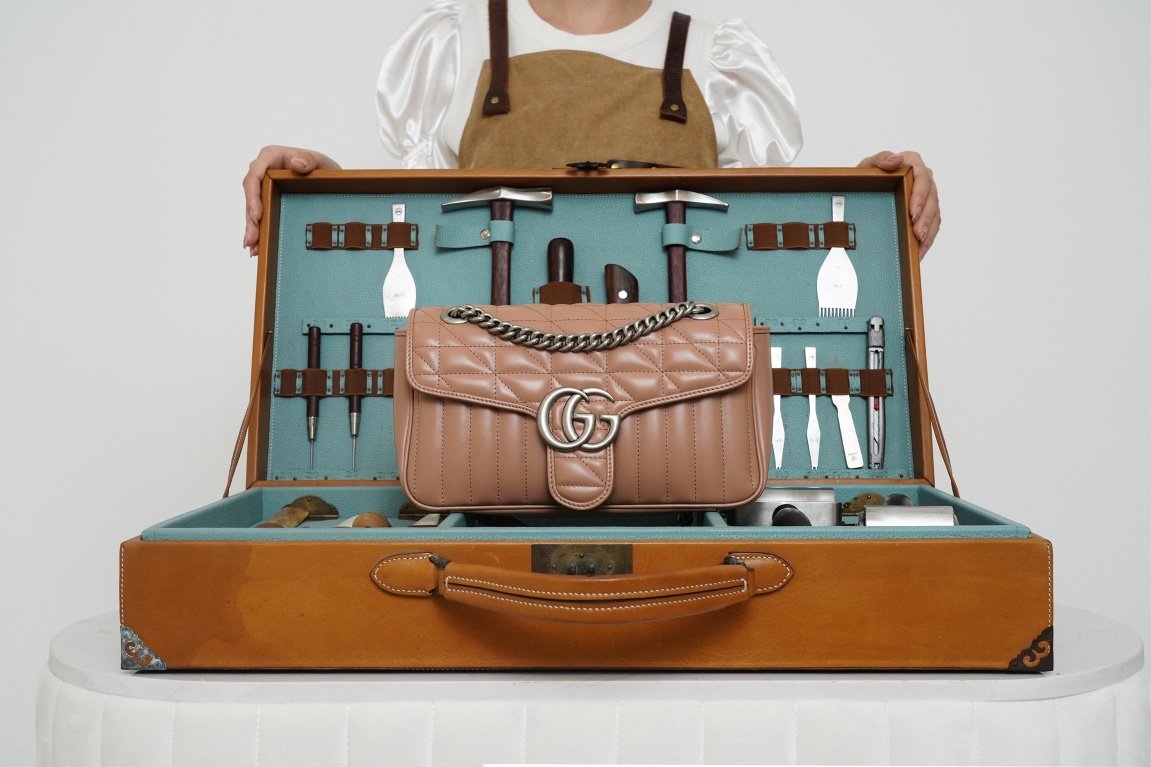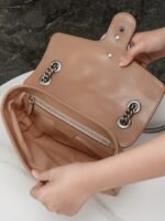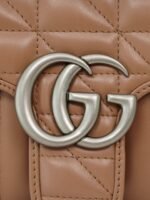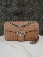 The Aria collection continues to boldly explore the brand’s classic symbolic elements. As part of the Favored Handbags Selection, the GG Marmont collection is revered for its signature quilted leather and double G monogrammed interwoven accessories. On this small shoulder bag, the classic material is incorporated with vertical and twill patterns to create a distinctive geometric style design.