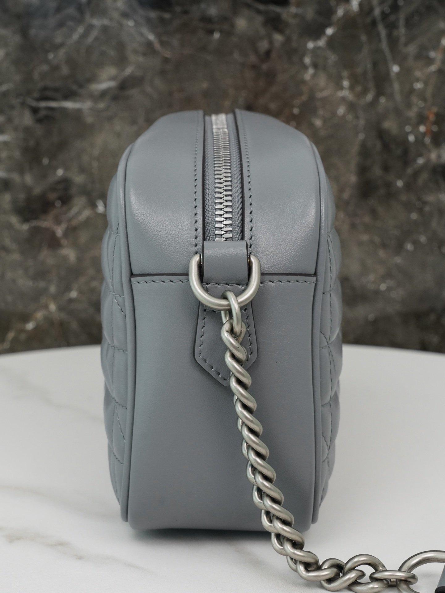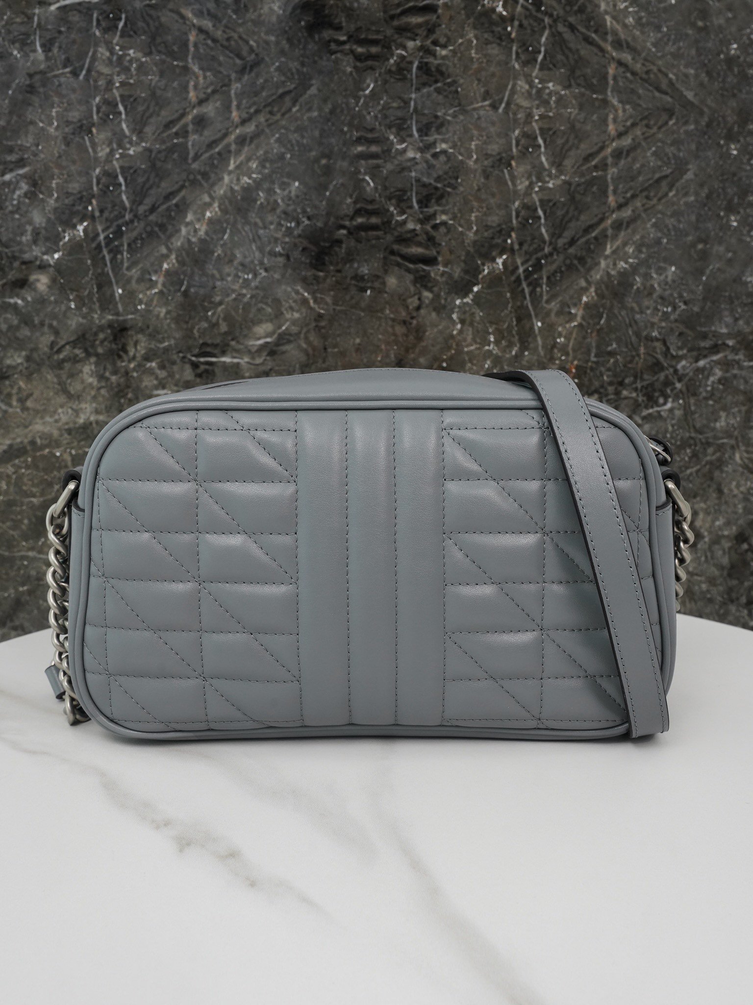 A part of the Favored Handbags Selection, the GG Marmont collection is revered for its signature double G monogram interwoven hardware and quilted leather. For the “Aria – Fashion Aria” collection, the GG Marmont collection revitalizes the classic materials with a geometric style, combined with double G styling accessories in antique silver tones, to present this stunning dark grey small shoulder bag.