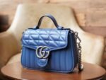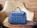 GG Marmont pieces are revitalized with striking new shades and textures. A recognizable addition to the Gucci Favors selection of handbags, highlights of the collection include double G accessories and quilted leather. For the new “Gucci’s March of Love” collection, two different geometric quilting patterns are presented in a new shade of blue. The silver Double G accessories add glamor to the mini handbag.
