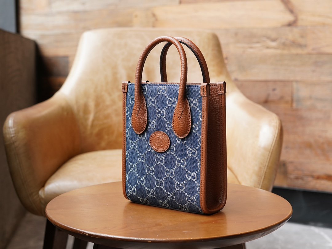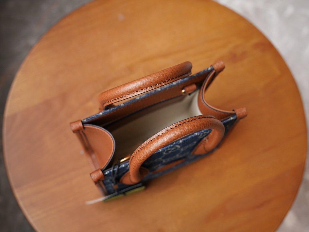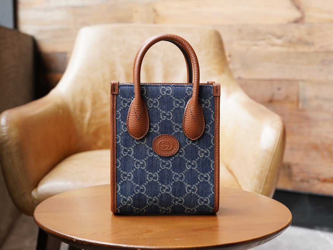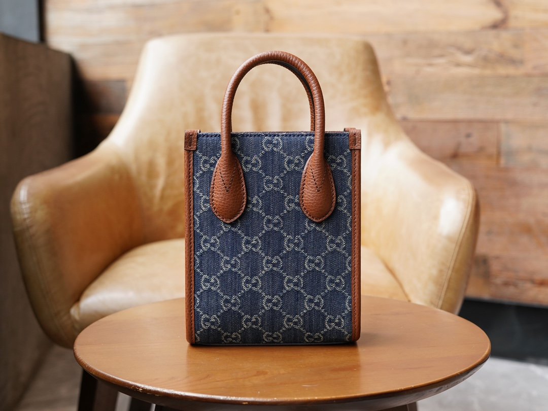 ๐†๐†๐‘๐ž๐ญ๐ซ๐จ Collection Mini Tote DenimnnGG Denim is a classic fabric that is widely used in the brand’s handbag and ready-to-wear collections. The material. In the “March of Love” fashion collection, this recognizable classic jacquard fabric is back again, using a full-body layered design, injecting rich details into a variety of classic items, and brown leather piping adds glamour to this mini tote bag. nSize: 16*20*7cmnModel No.: 671623