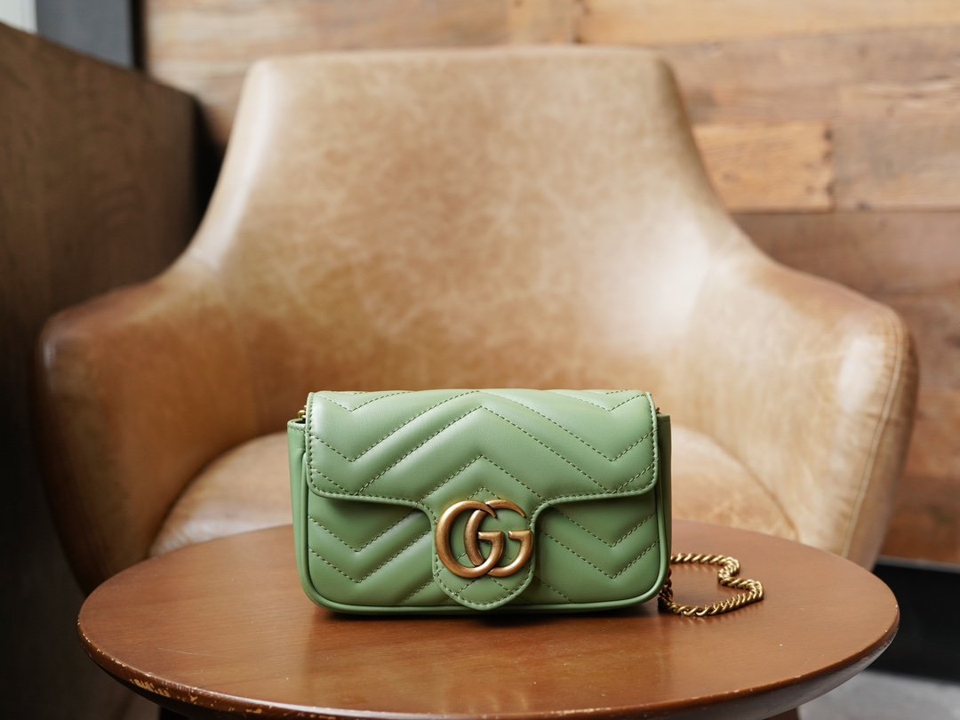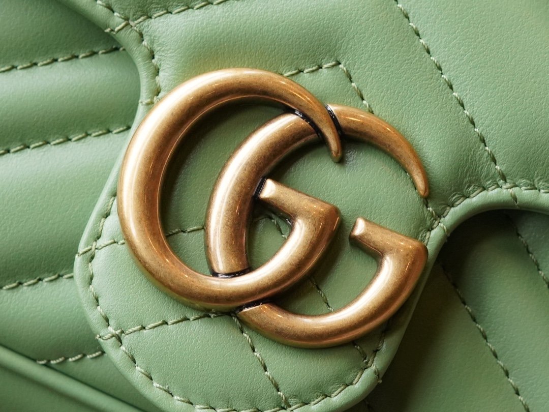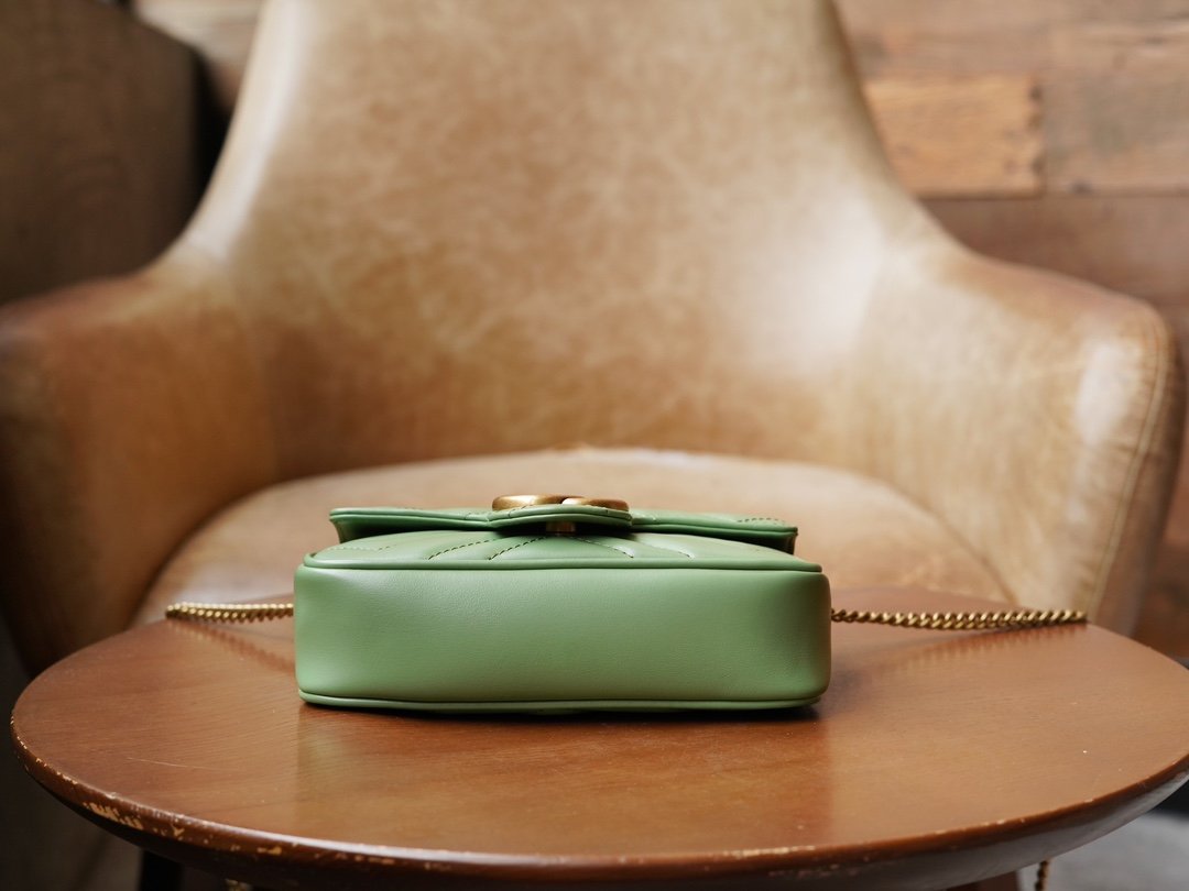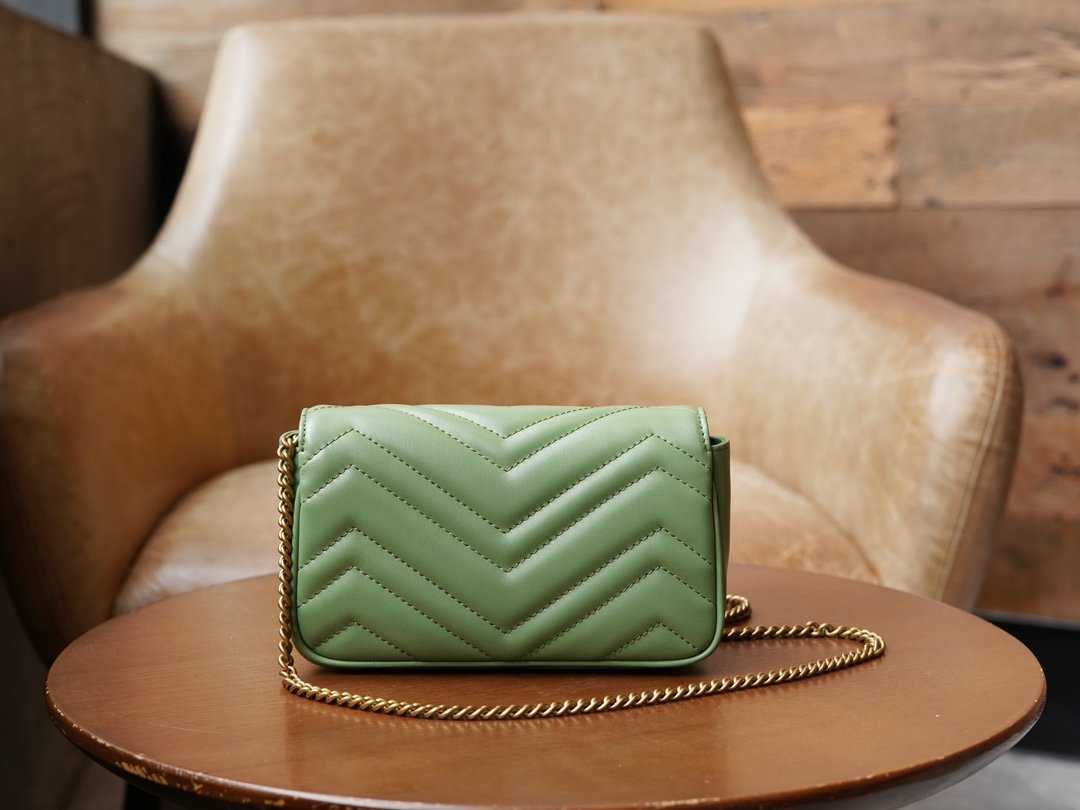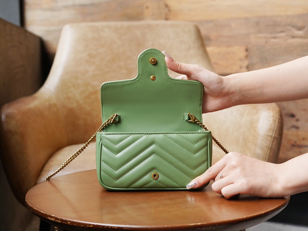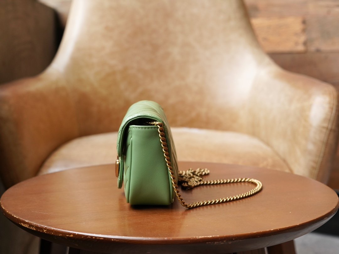 Crafted from green quilted leather, this mini handbag from the GG Marmont collection has a soft, yet upright shape. It is also adorned with the collection’s signature double G element, derived from three-dimensional details inspired by the 1970s canonical design.