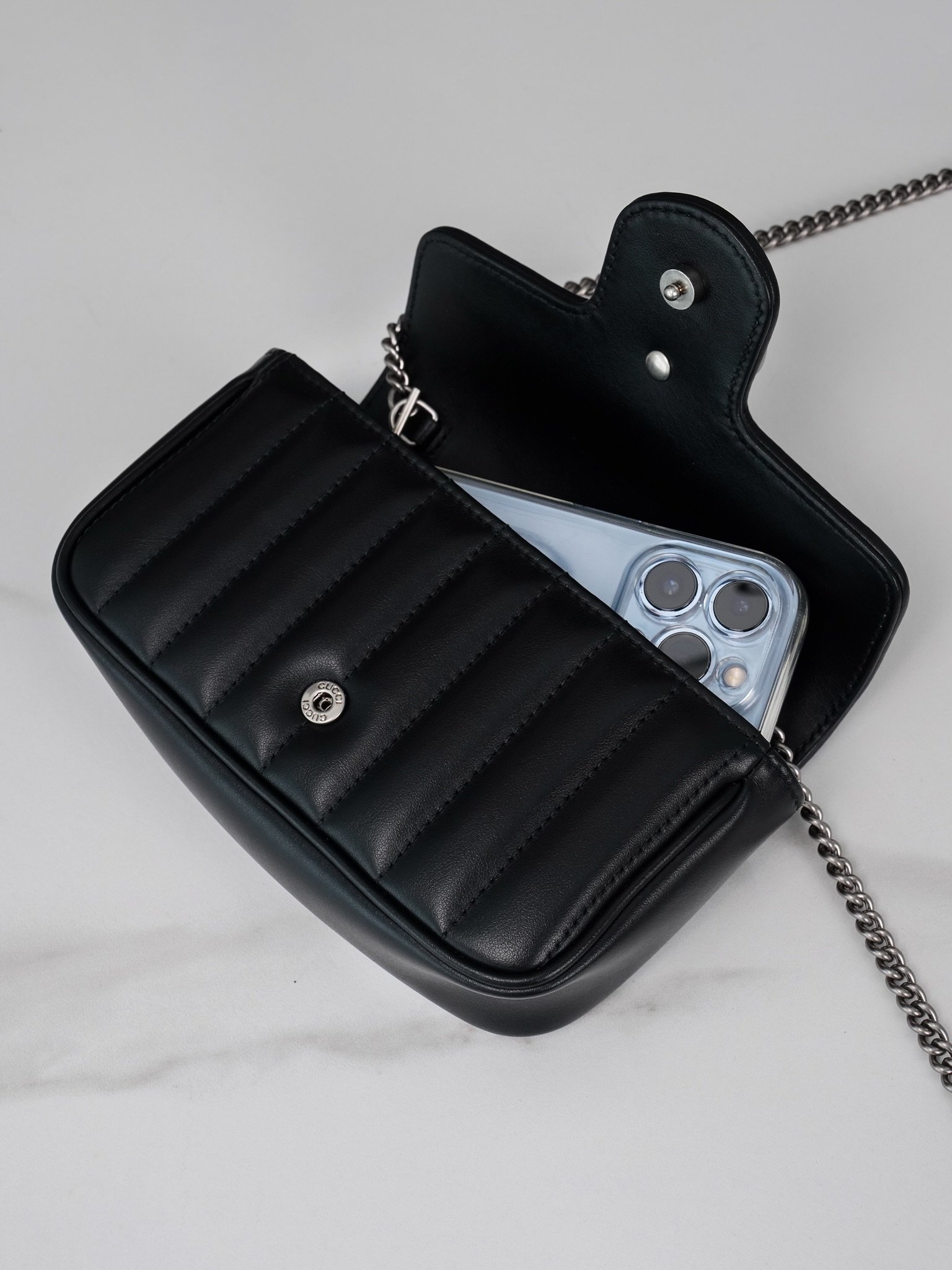 n A classic accessory that illustrates the brand’s visionary design through its ultra-miniature design. This shoulder bag is a stunning addition to the GG Marmont collection, incorporating interwoven double G fittings and quilting, using a combination of diagonal and vertical stripes to reinterpret classic quilting elements. The Double G fittings from the 70’s are designed in antique silver tones, complementing the black leather.