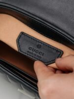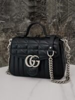 The Aria collection continues to explore the House’s heritage and tells the story of Gucci’s design through a blend of classic and contemporary approaches.The GG Marmont collection, a signature of the Creative Director’s early years at the House, is updated each season with fresh perspectives and ideas. This mini handbag is crafted in soft black quilted leather with vintage-inspired antique silver tone hardware.