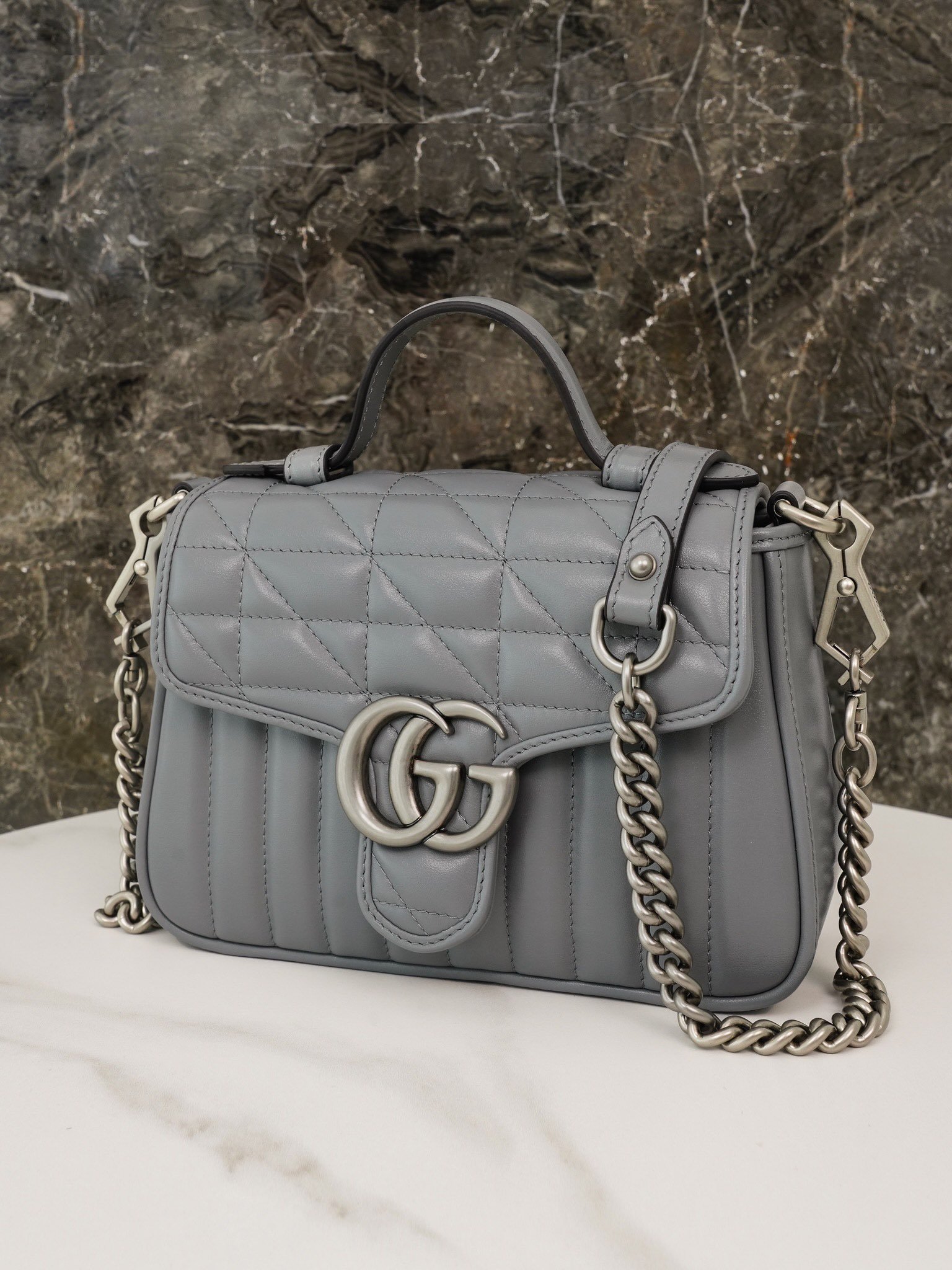 The Aria collection explores the House’s heritage and tells the story of Gucci’s design through a fusion of classic and modern. the GG Marmont collection, a masterpiece created by the Creative Director at the beginning of his tenure at the House, is updated each season with fresh perspectives. This mini handbag is crafted in supple gray quilted leather with vintage-inspired antique silver-tone hardware.