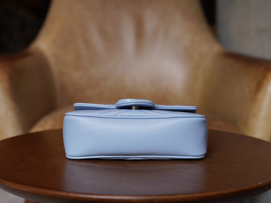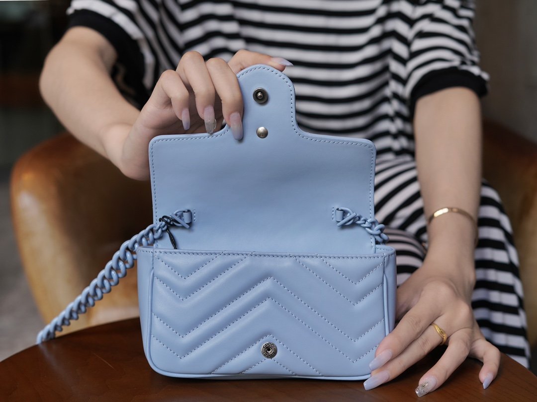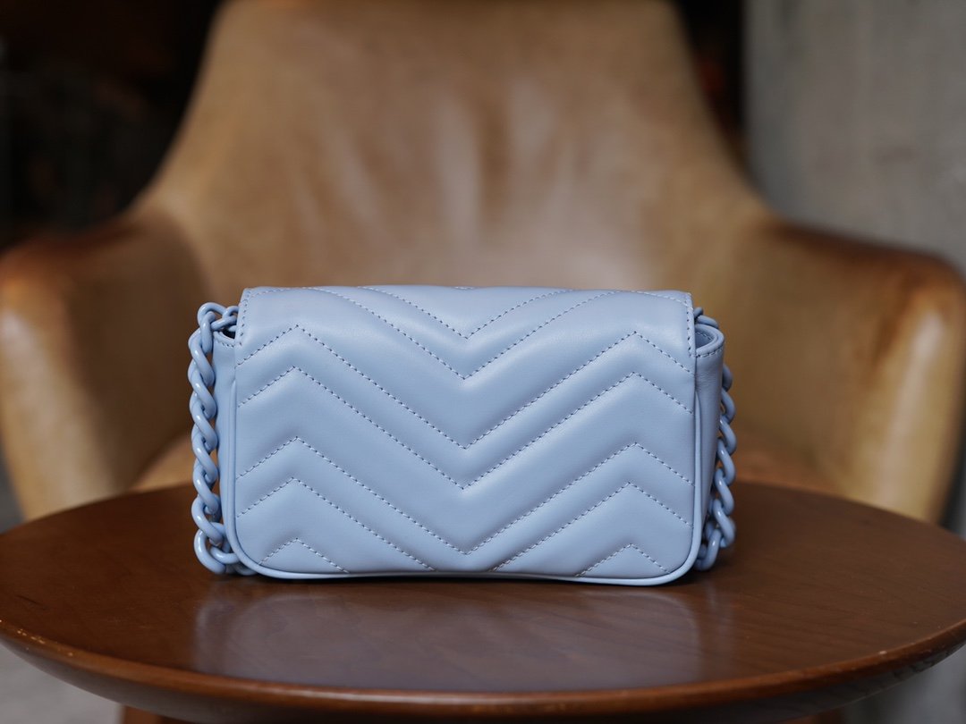 Accessories continue to play an integral role in the collection created by the Creative Director of the brand. This fanny pack combines a fresh perspective on design aesthetics, emphasizing the flexible use of different elements to create a contemporary accessory piece. In light blue V-shaped quilted leather with a chain strap, it is a stunning addition to the GG Marmont collection.