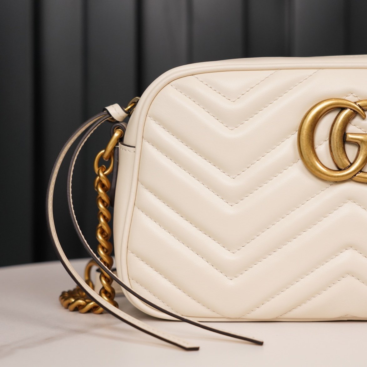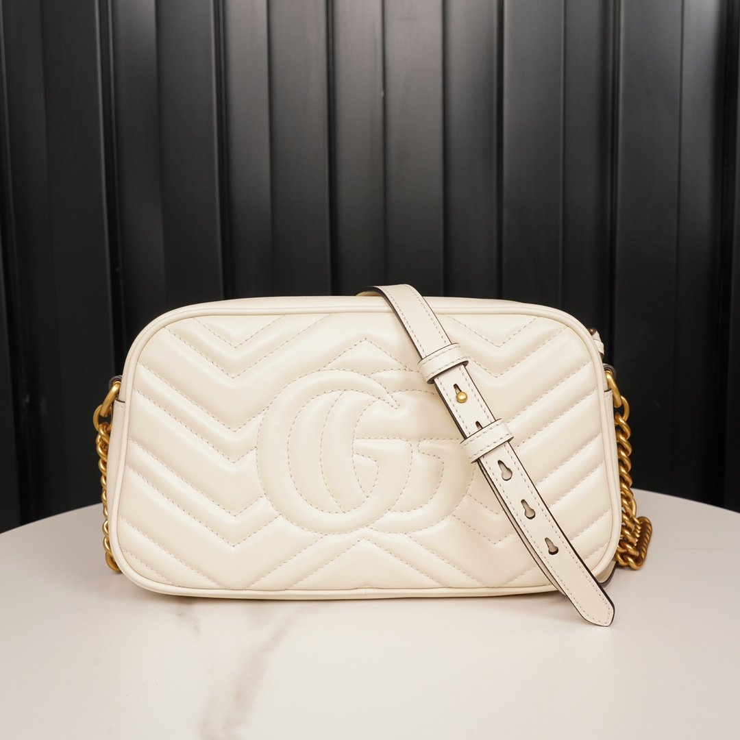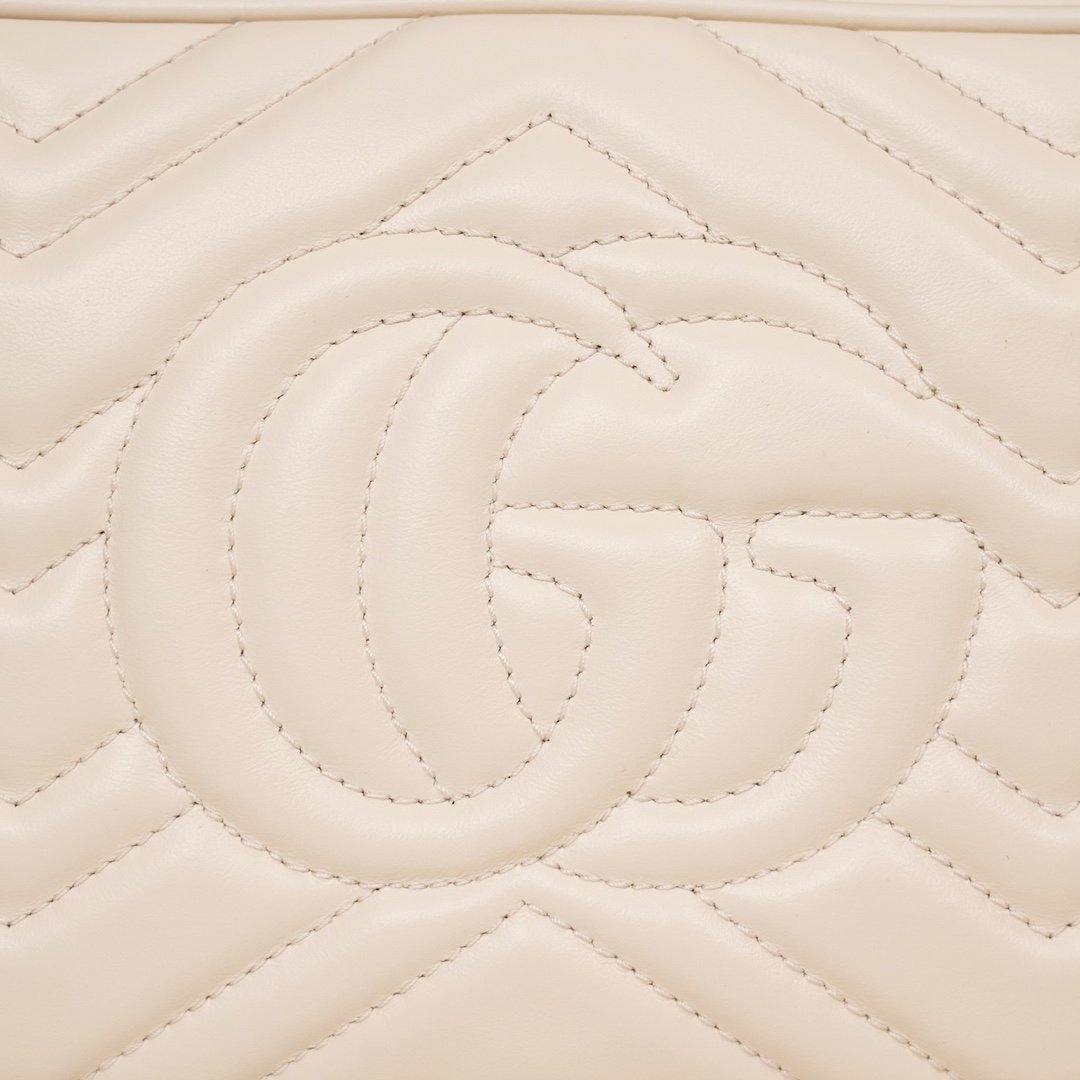 rather Structured soft shape with top zipper closure with double G metal hardware. Leather shoulder pads with chain shoulder strap detailing for greatly increased wearing comfort. Wave pattern quilted leather with double š logo on the back, the overall shape of the soft but not too stiff
