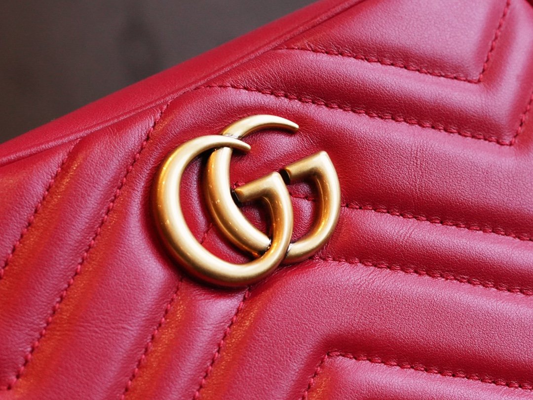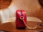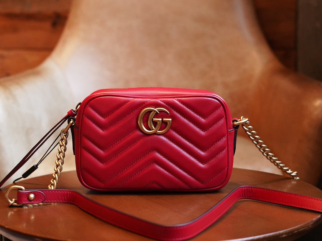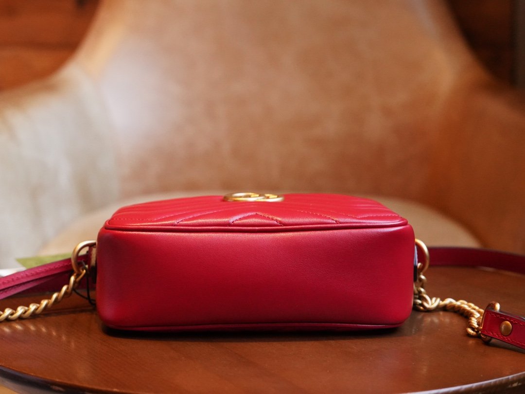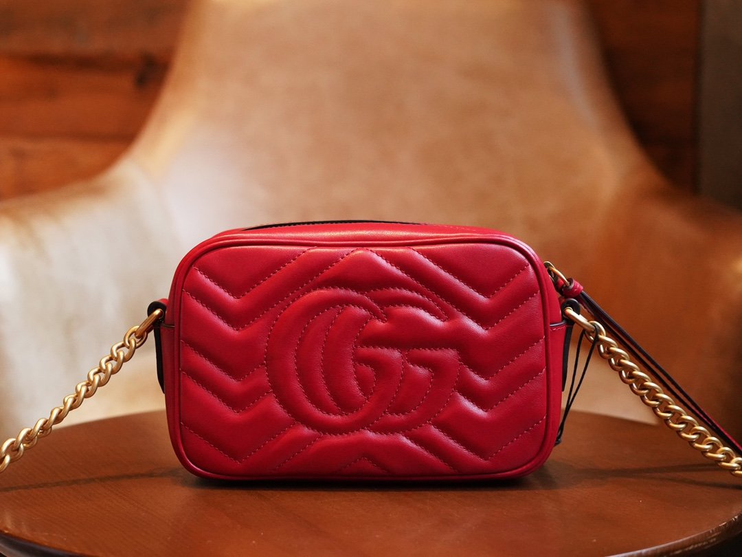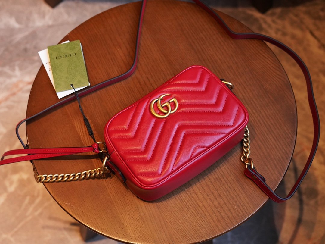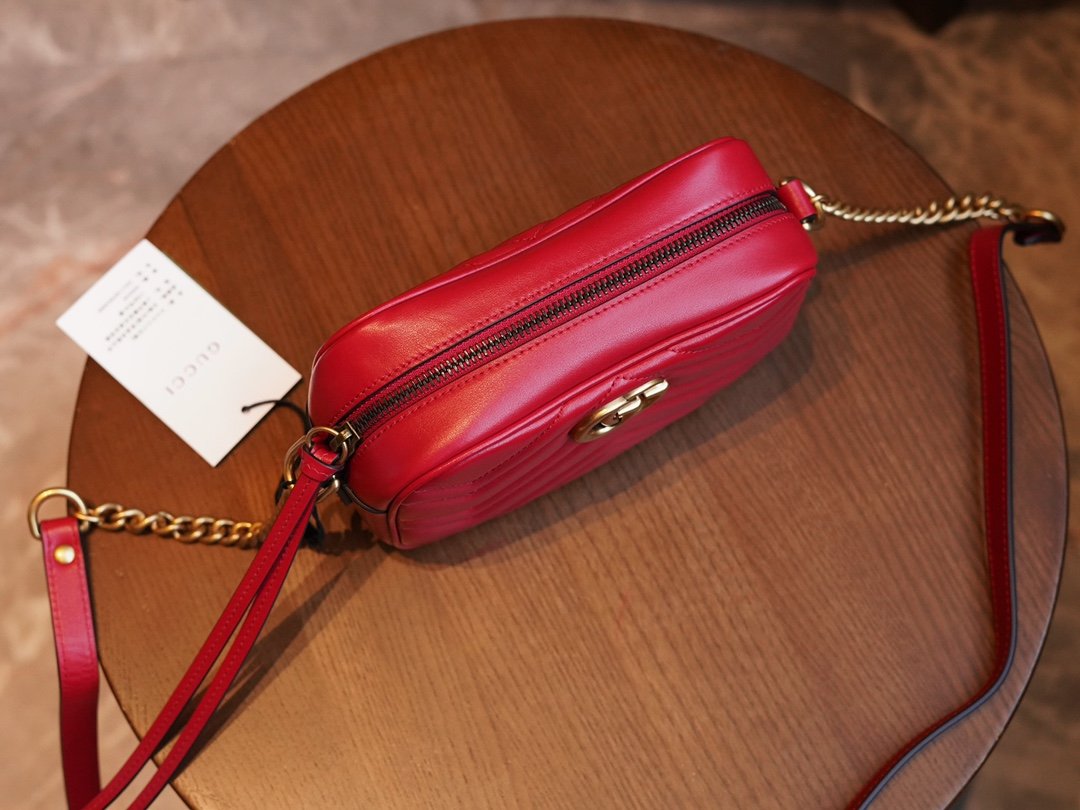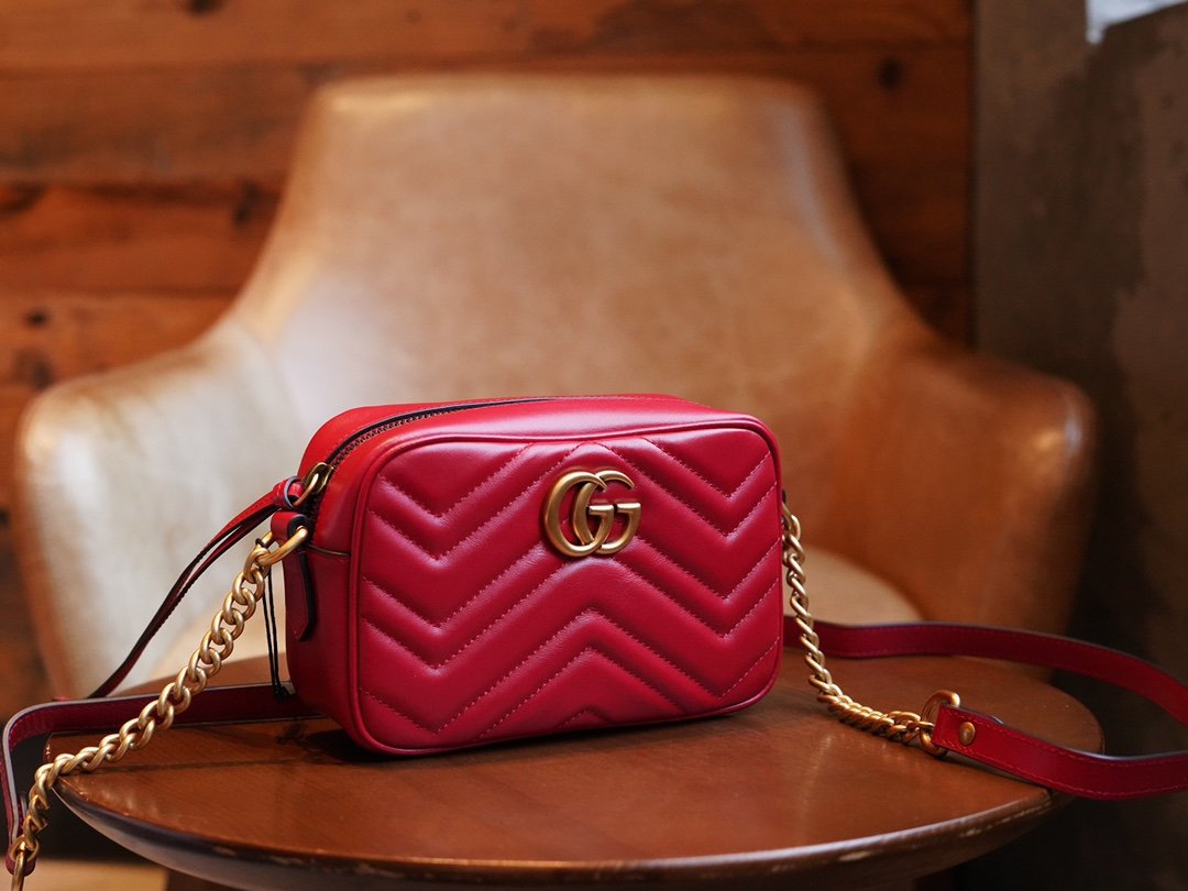 Home BAGS GUCCI ๐†๐† ๐Œ๐š๐ซ๐ฆ๐จ๐ง๐ญ Series Mini Camera Bag Red n quite Structured soft shape with top zipper closure with double G metal hardware. Leather shoulder pads with chain shoulder strap detailing for greatly increased wearing comfort. Wave pattern quilted leather with double ๐† logo on the back, the overall shape is soft but not too strong. Since its launch, the n camera bag series has had an intriguing fashion tone, and has been presented in an avant-garde retro style with a drop-dead simple temperament ใ€ฐใ€ฐใ€ฐnSize: 18*12*6cm nModel No.: 448065