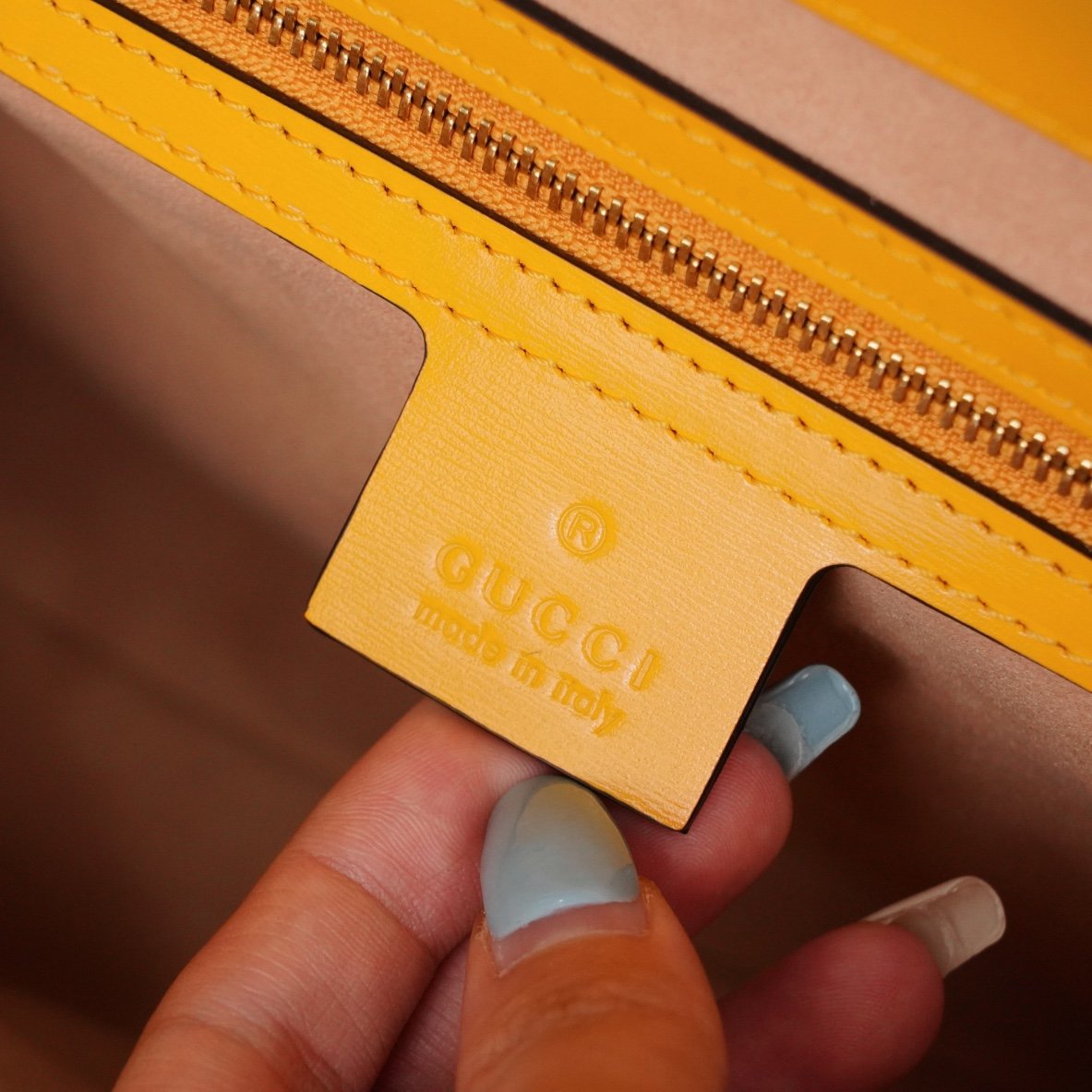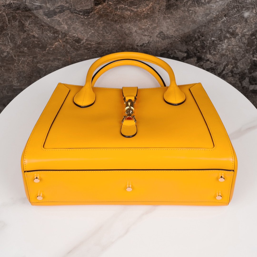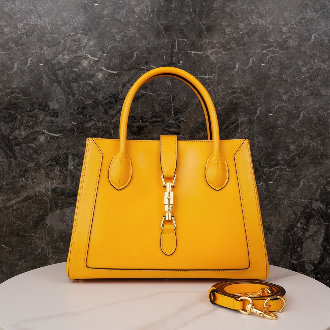 The classic Jackie 1961 line of handbags, first introduced in 1961, features a new tote bag with a detachable shoulder strap in the Epilogue collection. Crafted in bright yellow leather, this medium tote bag is adorned with the collection’s signature push-in closure.