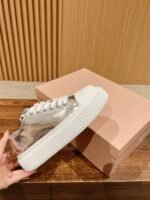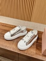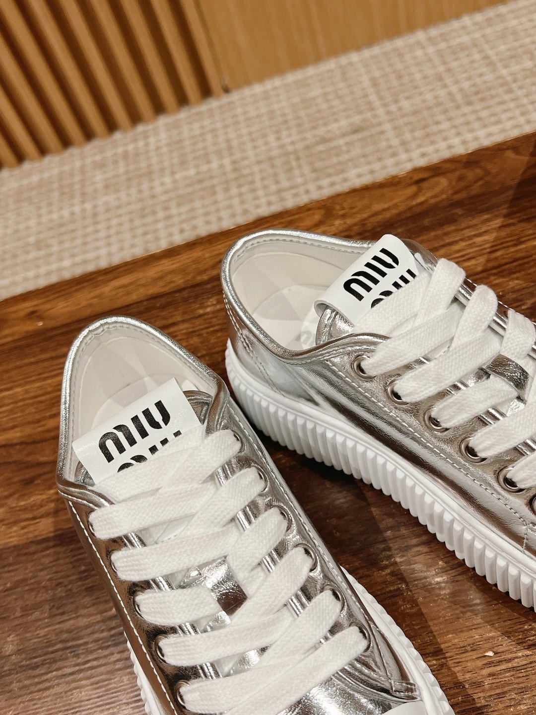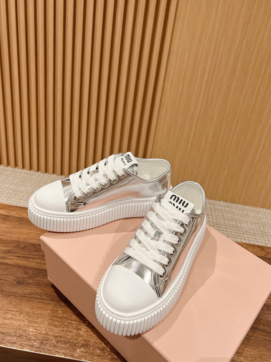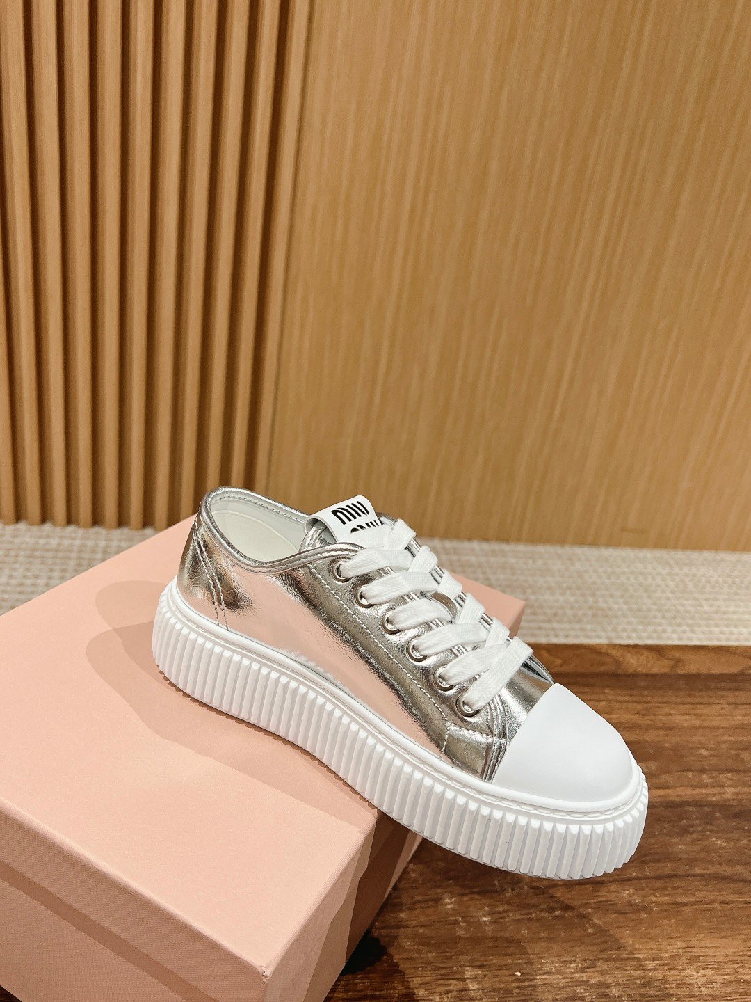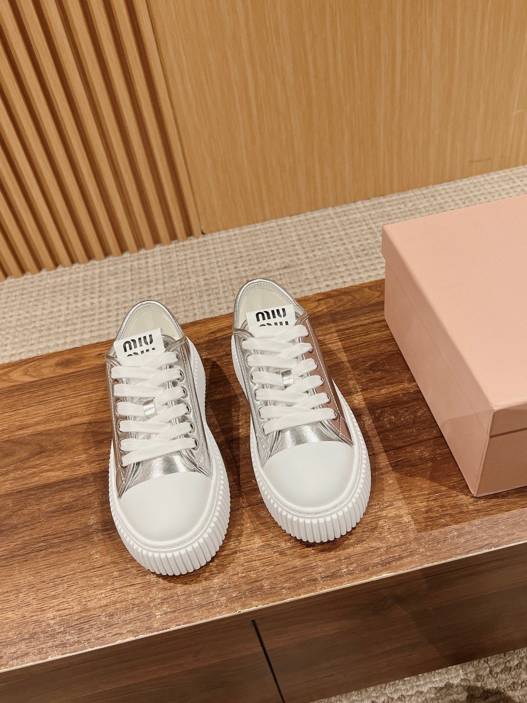 𝐌𝐢𝐮 𝐌𝐢𝐮 𝟮𝟬𝟮𝟱 /𝐬𝐬#Miu Miu Spring/Summer New Biscuit Shoes Forrest Gump Shoes Casual Sneakers nnmiumiu’s newest explosion Avant-garde and bold design, the Miu Miu style is fused into the simple lines of this thick-soled canvas sneaker,nn chic logo adorned on the tongue and the back, embellished with a vintage design, adding an iconic element! Thick sole design defines the avant-garde modern stylennFabric: Original customized fabric/cow suede Lining: Original imported soft lamb’s wool Sole: Original molded non-slip rubber outsolennSole thickness: approx. 4.5cmnnSize: 35-40 (40 customized non-returnable)