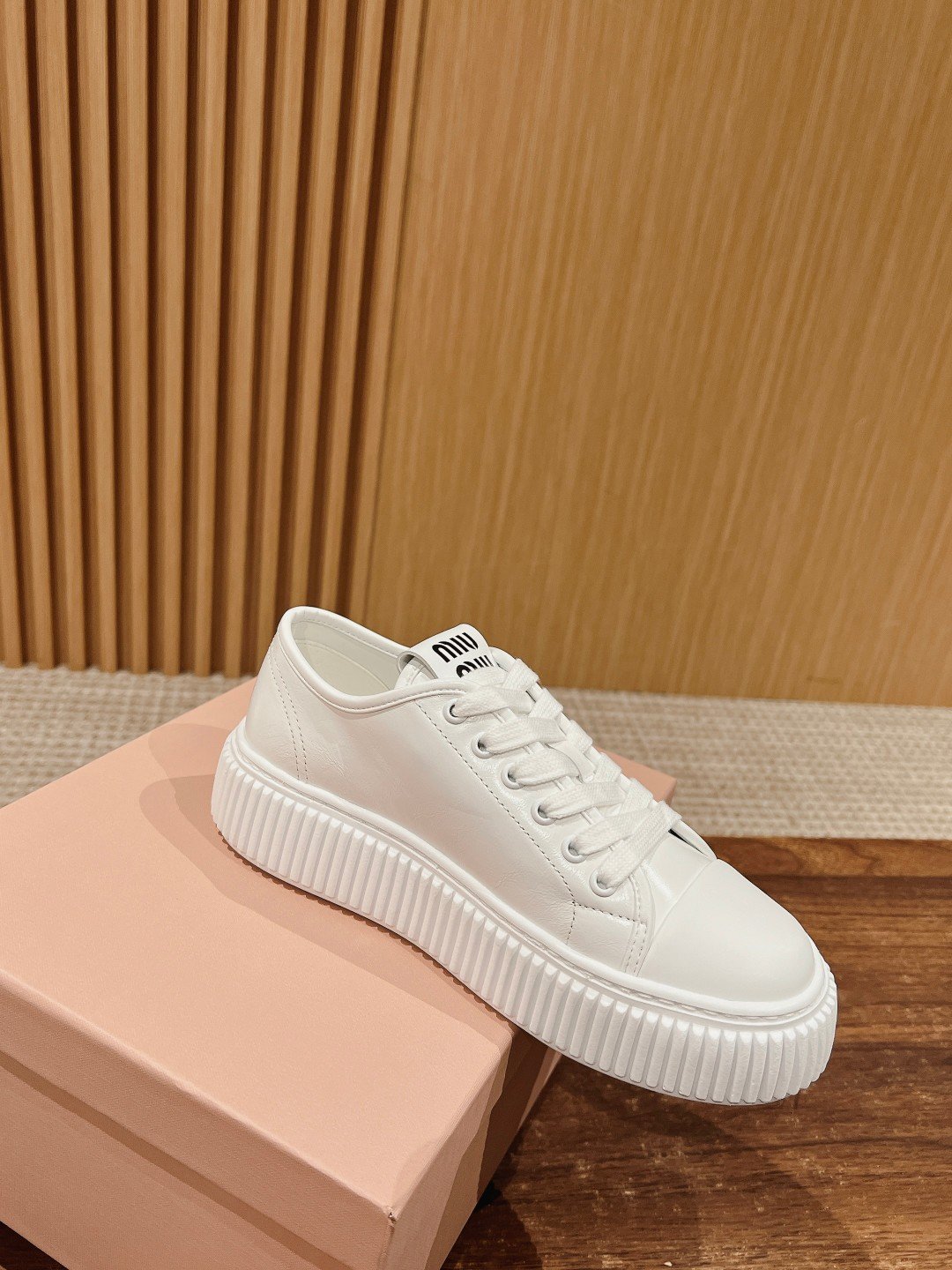 缪缪新款复古时尚厚底饼干小白鞋低调奢华鞋子整体超轻不挑脚型款式真的简约又好看越久越耐看的一款吸睛神器 MiuMiu的粉丝那么今年夏天脚上怎能少一双帆布饼干鞋呢 皮面材质 内里透气帆布 垫脚柔软舒适羊皮 防滑耐磨EVA大底 底厚4cm Size定做不退换