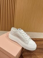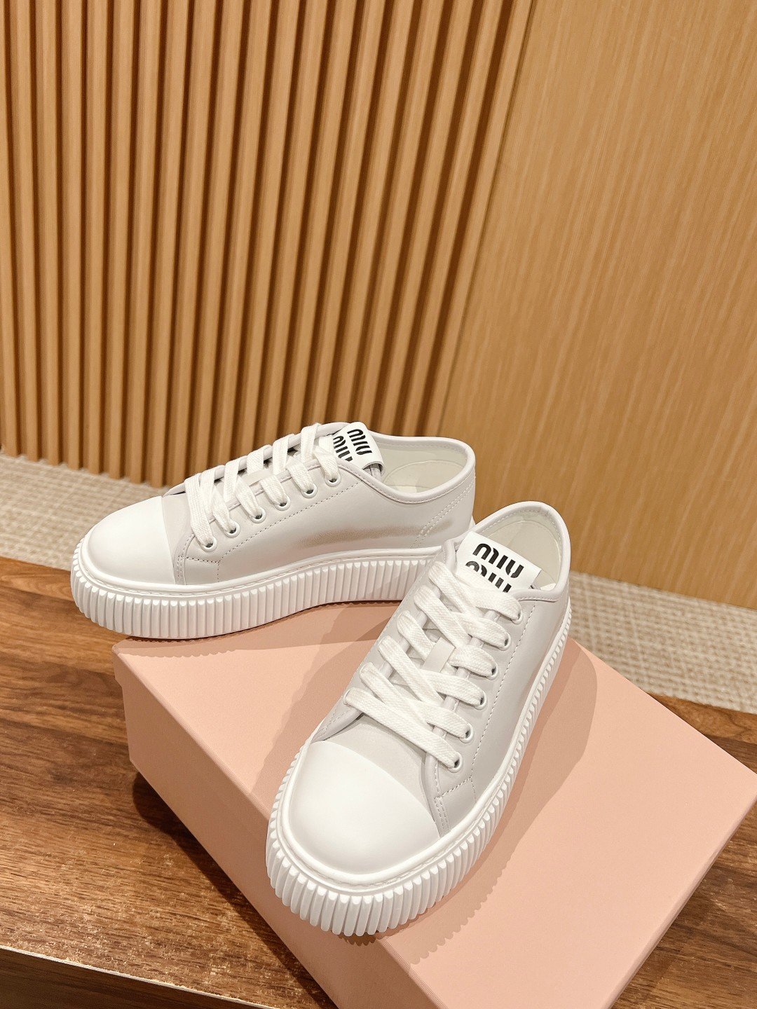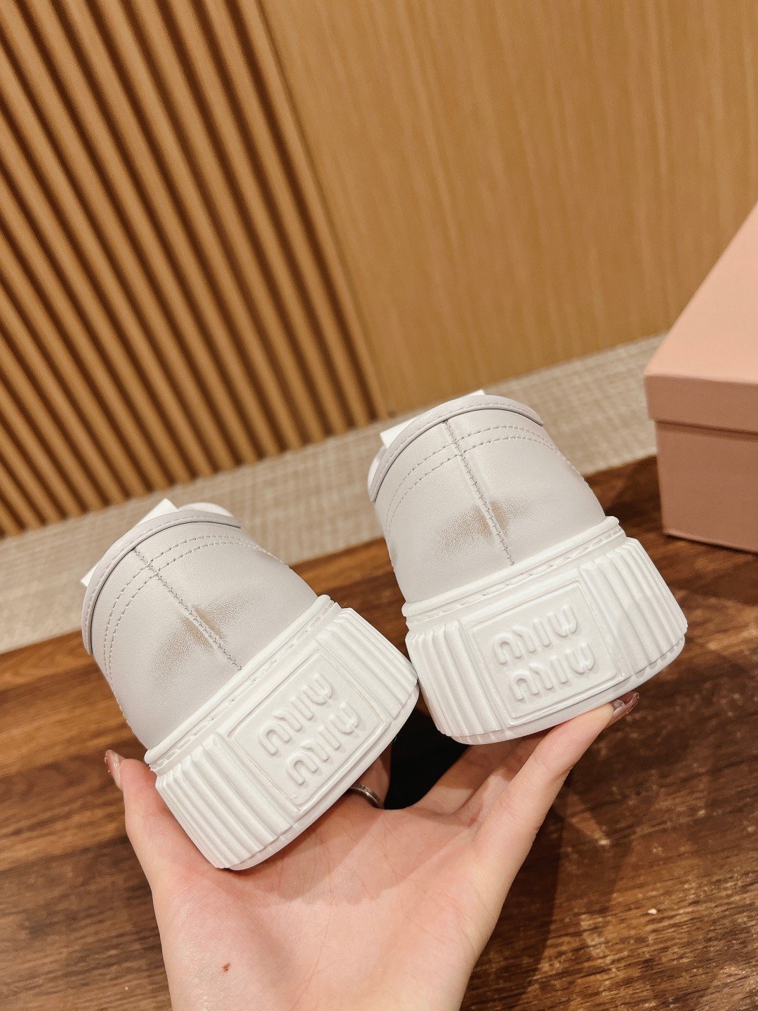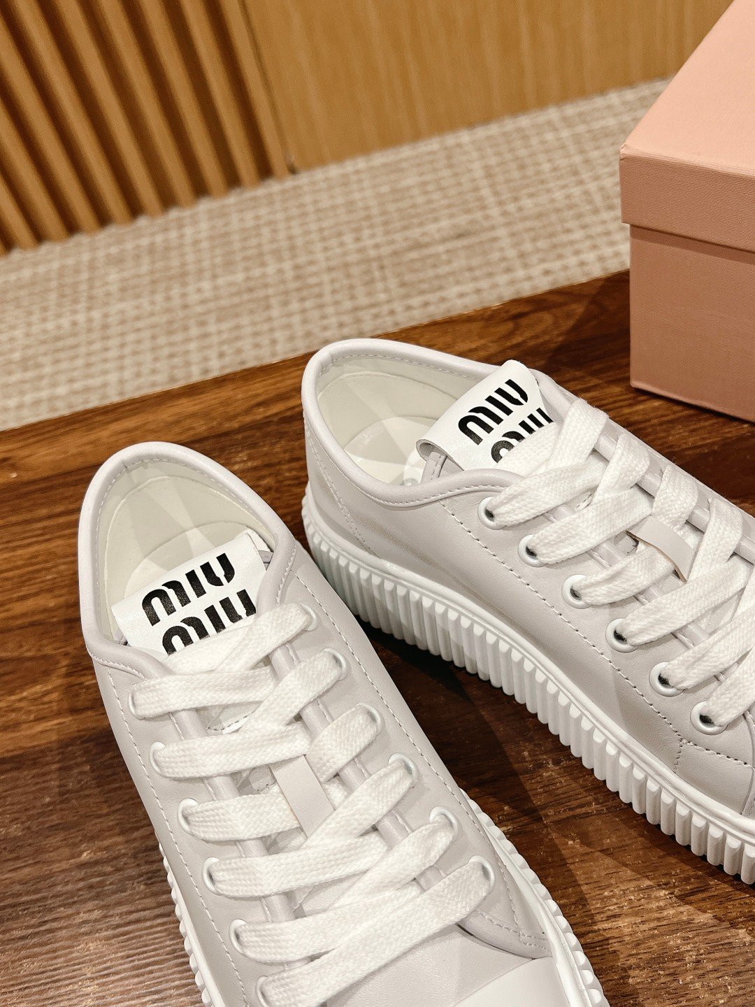 𝐌𝐢𝐮 𝐌𝐢𝐮 𝟮𝟬𝟮𝟱 /𝐬𝐬#Miu Miu Spring/Summer New Biscuit Shoes Forrest Gump Shoes Casual Sneakers nnmiumiu’s newest explosion Avant-garde and bold design, the Miu Miu style is fused into the simple lines of this thick-soled canvas sneaker,nn chic logo adorned on the tongue and the back, embellished with a vintage design, adding an iconic element! Thick sole design defines the avant-garde modern stylennFabric: Original customized fabric/cow suede Lining: Original imported soft lamb’s wool Sole: Original molded non-slip rubber outsolennSole thickness: approx. 4.5cmnnSize: 35-40 (40 customized non-returnable)