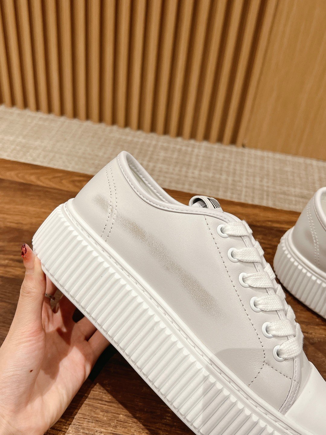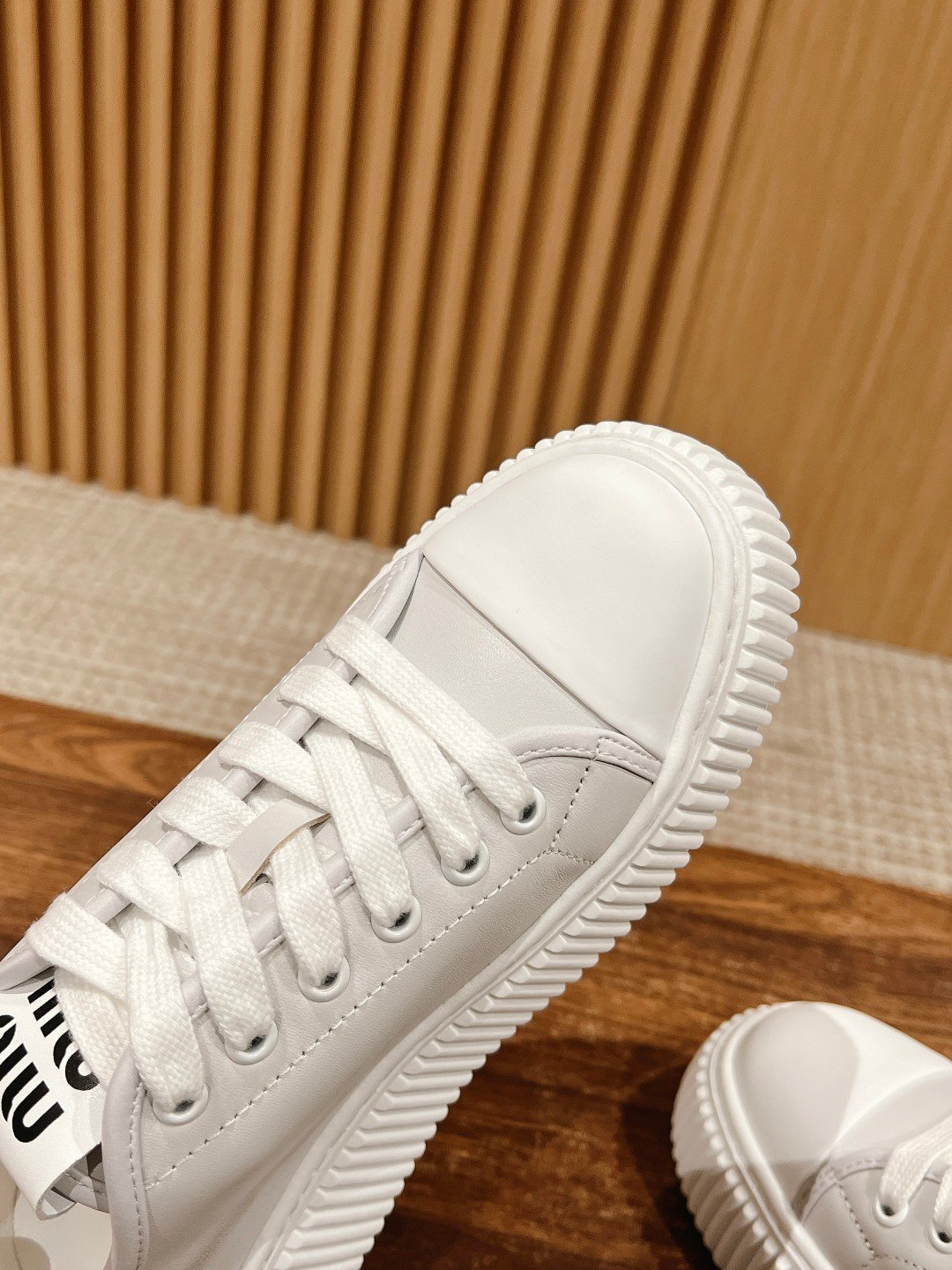 缪缪新款复古时尚厚底饼干小白鞋低调奢华鞋子整体超轻不挑脚型款式真的简约又好看越久越耐看的一款吸睛神器 MiuMiu的粉丝那么今年夏天脚上怎能少一双帆布饼干鞋呢 皮面材质 内里透气帆布 垫脚柔软舒适羊皮 防滑耐磨EVA大底 底厚4cm Size定做不退换