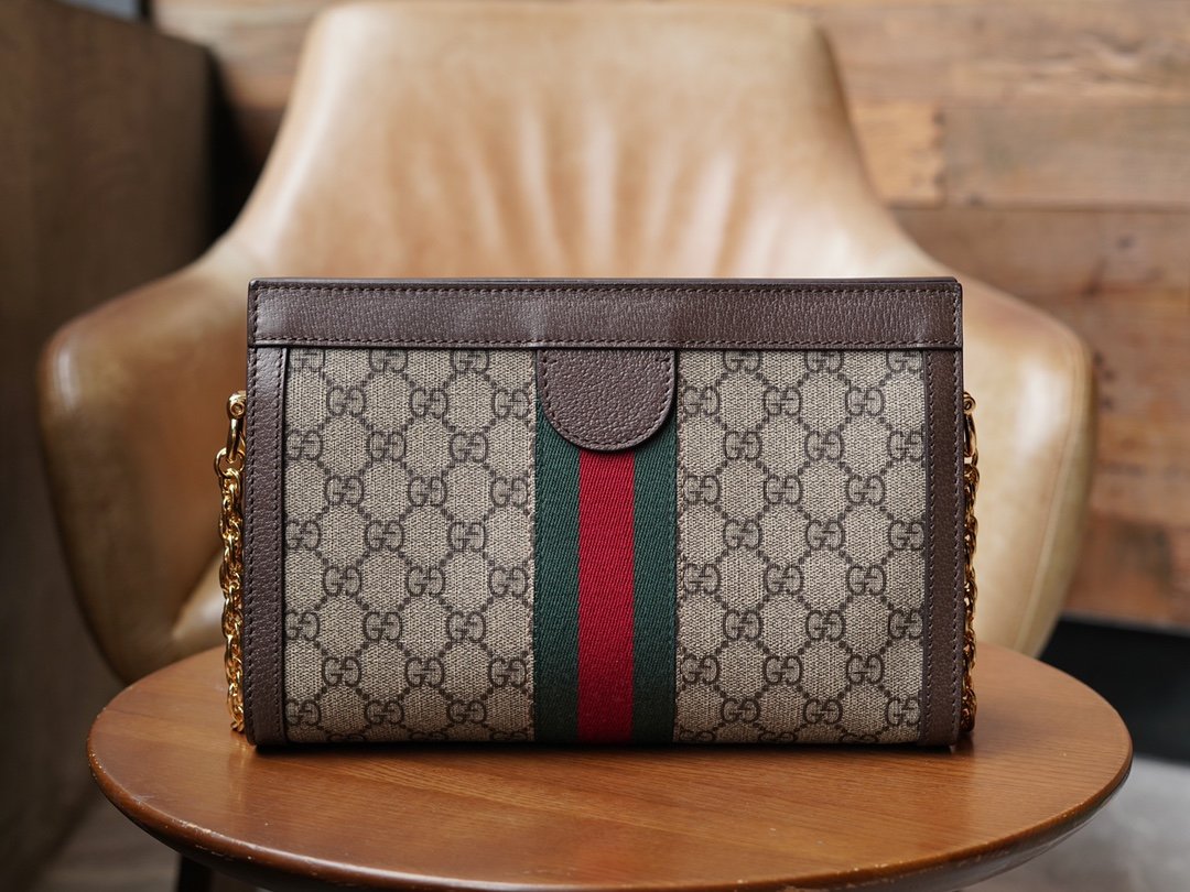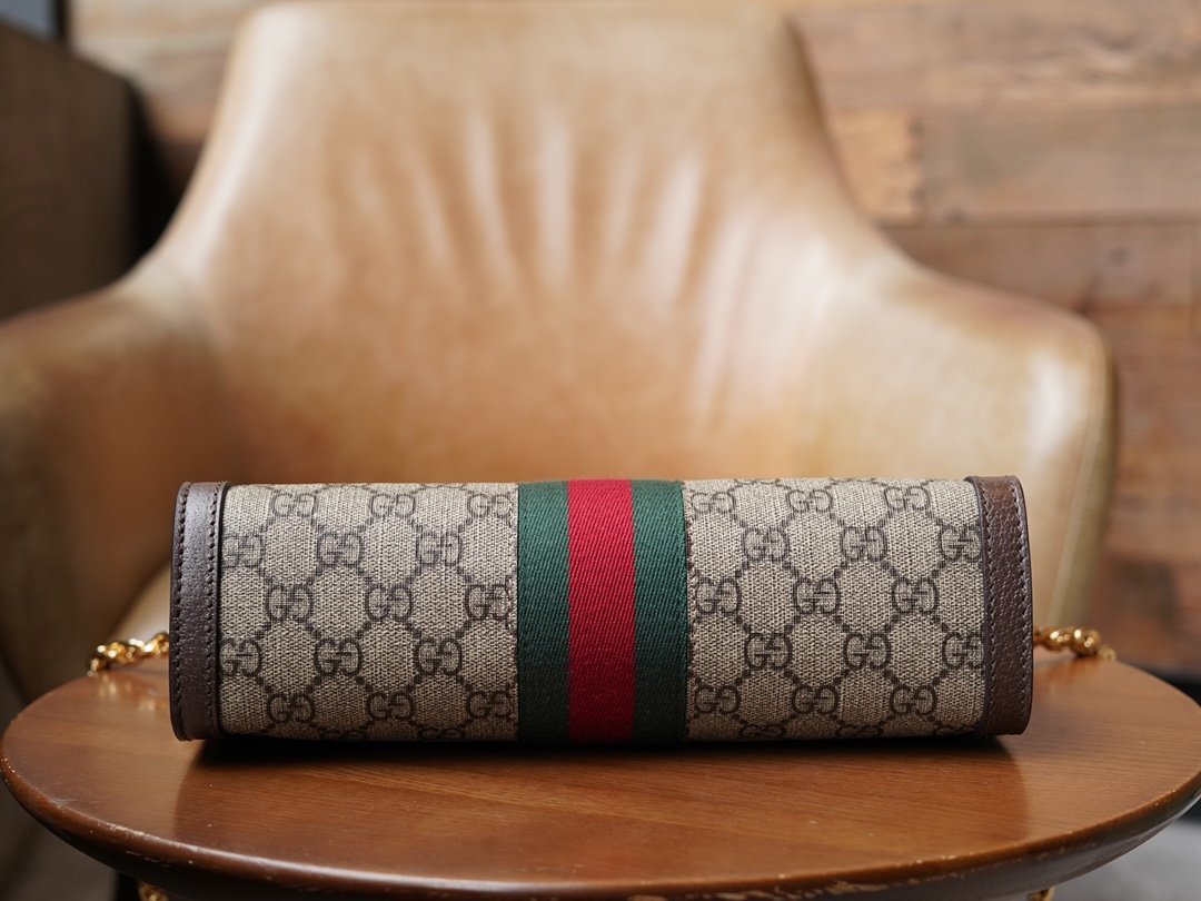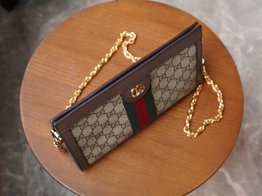 𝐎𝐩𝐡𝐢𝐝𝐢𝐚 Collection Small Envelope Bag Classic Canvas nnThis chain-strap shoulder bag is crafted from GG Supreme canvas! It has been crafted in GG Supreme canvas with appliquéd striped webbing details for a vintage-inspired design. It has a structured shape with a magnetic closure, leather piping and is decorated with a classic detail – double G fittings. nSize: 26*17.5*8cmnModel No.: 503877