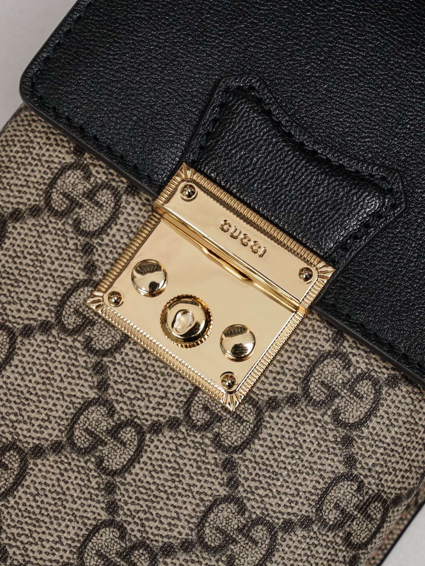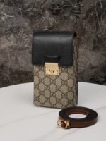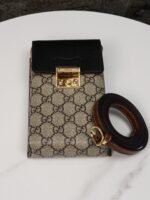 This Padlock Collection Mini Cell Phone Bags draws its inspiration from canonical designs. It features the iconic key and lock fittings of the collection’s handbags. Crafted in beige and ebony GG Supreme canvas with black leather, the bag has a detachable shoulder strap that can easily be converted from a shoulder bag to a handbag, exuding an elegant and stylish look.