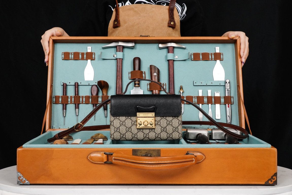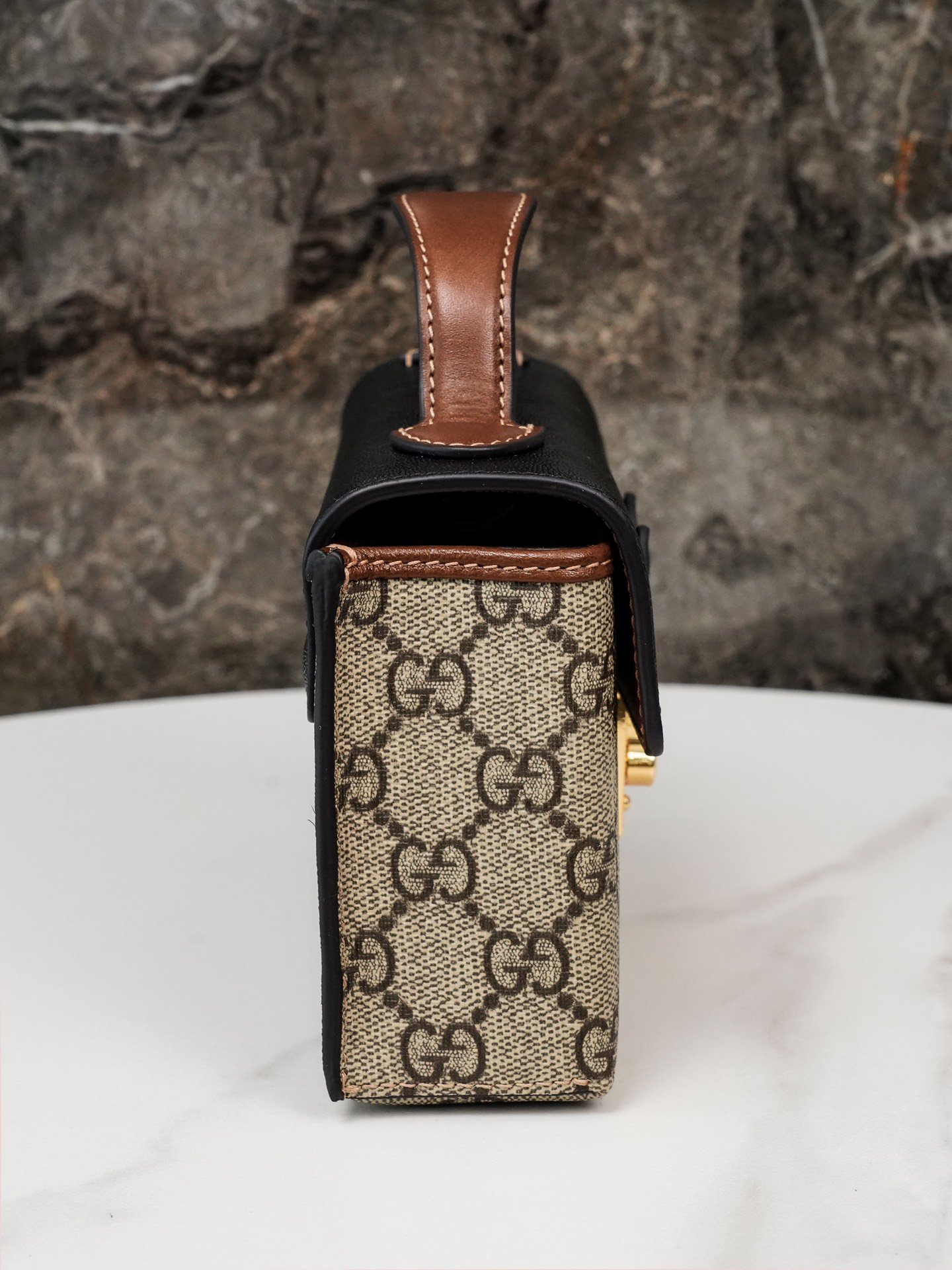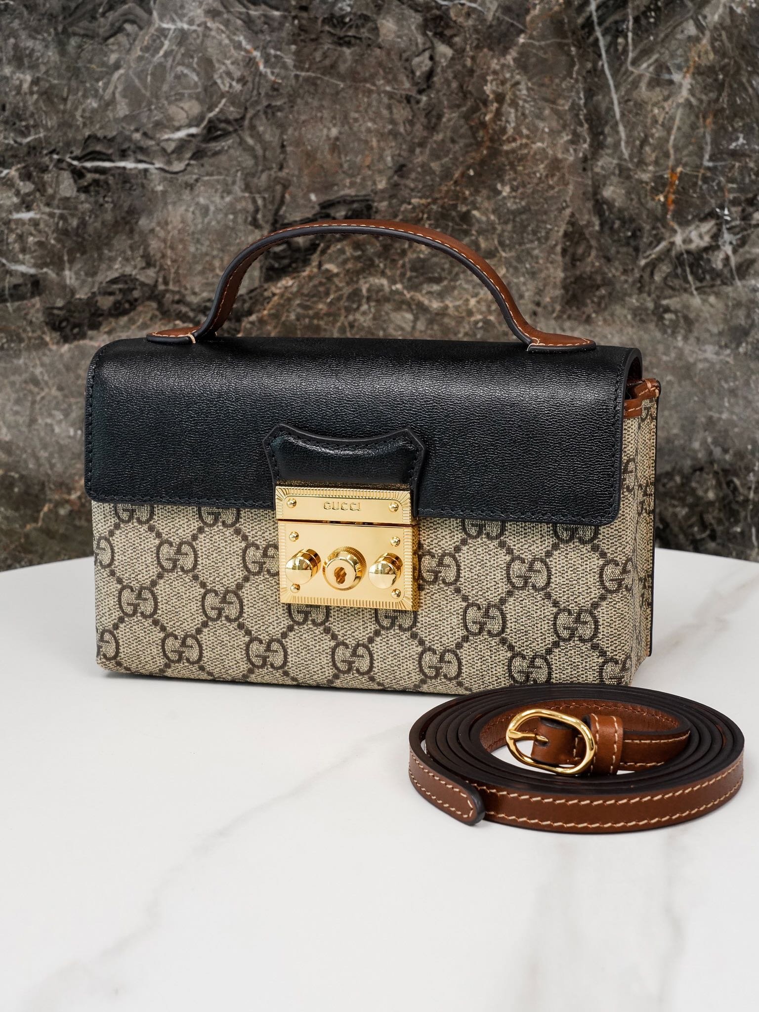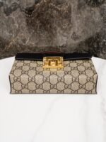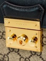Padlock collection introduces a new mini handbag with a colorful use of leather and canvas materials. The new mini handbag from the Padlock collection features a colorful mix of leather and canvas for a striking look. Crafted in the brand’s distinctive double G monogrammed canvas, the bag features a black leather upper body with the collection’s signature lock detail. A brown leather shoulder strap and carry handle add eye-catching contrasting details. The brand makes excellent use of different materials and color tones to create a fashionable mix and match design.