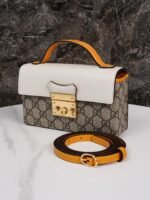 Padlock collection introduces a new mini handbags, the use of colorful leather and canvas materials to create a great look. The new mini handbag from the Padlock collection features a colorful mix of leather and canvas for a striking look. Crafted in the brand’s distinctive double G monogrammed canvas, the bag features a white leather upper body with the collection’s signature lock detail. A warm yellow leather shoulder strap and carry handle add eye-catching contrasting details. The brand makes excellent use of different materials and color tones to create a fashionable mix and match design.