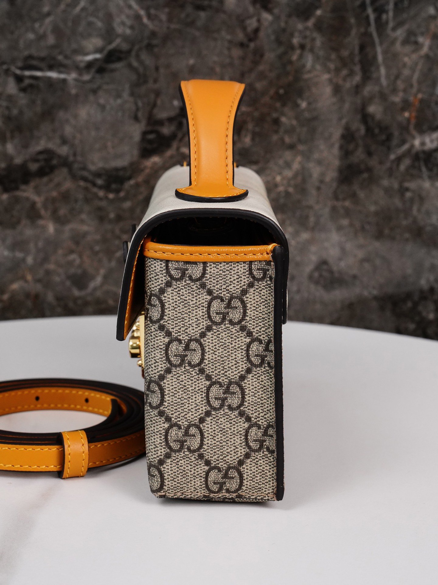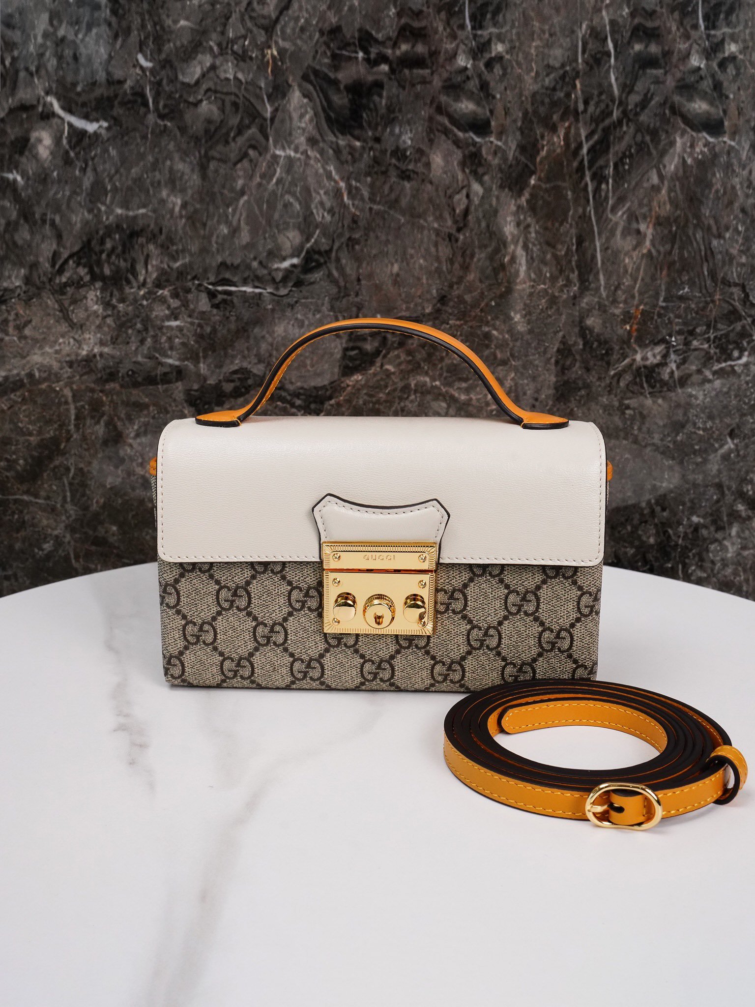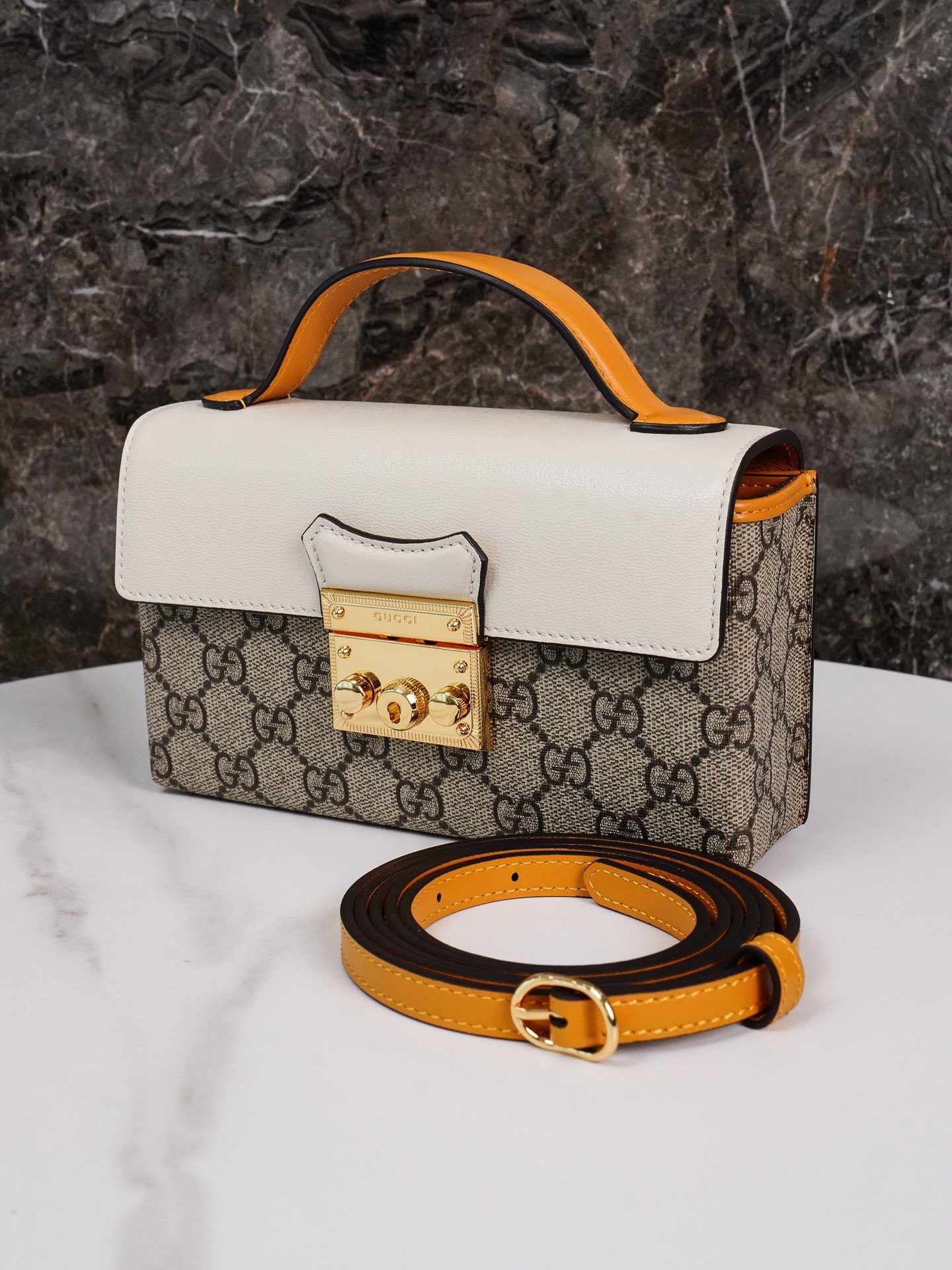 ๐๐š๐๐ฅ๐จ๐œ๐ค Collection of mini handbags Handbags Withdrawal White nnPadlock collection introduces a new mini handbags, the use of colorful leather and canvas materials to create a great look. The new mini handbag from the Padlock collection features a colorful mix of leather and canvas for a striking look. Crafted in the brand’s distinctive double G monogrammed canvas, the bag features a white leather upper body with the collection’s signature lock detail. A warm yellow leather shoulder strap and carry handle add eye-catching contrasting details. The brand makes excellent use of different materials and color tones to create a fashionable mix and match design. nSize: 18*10*5cmnModel No.: 652683