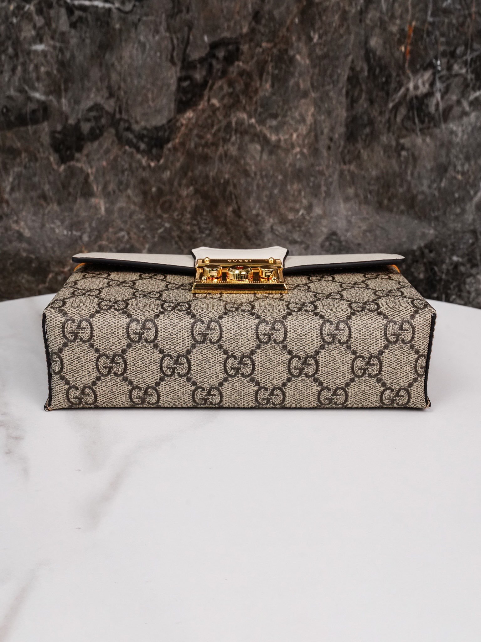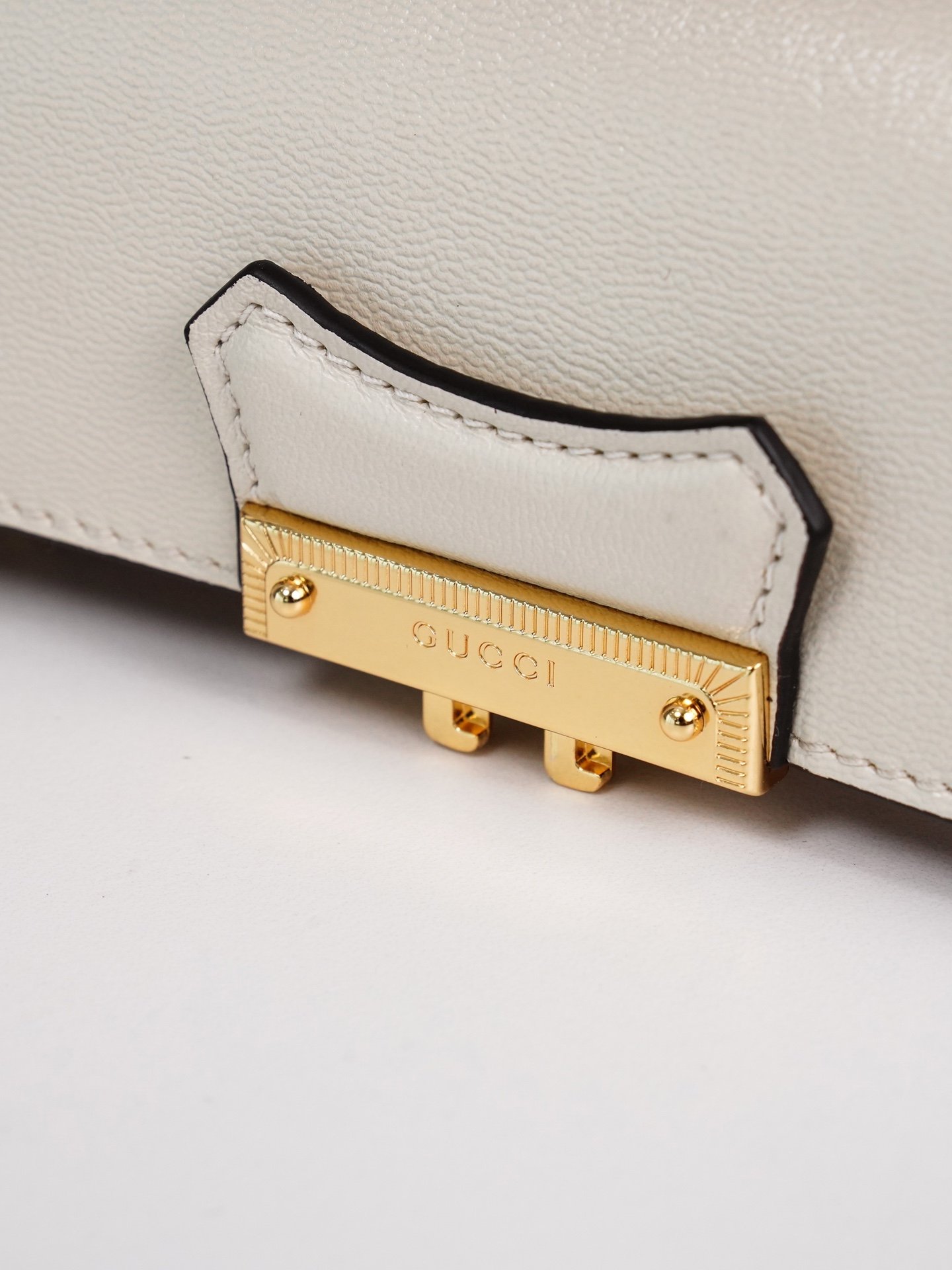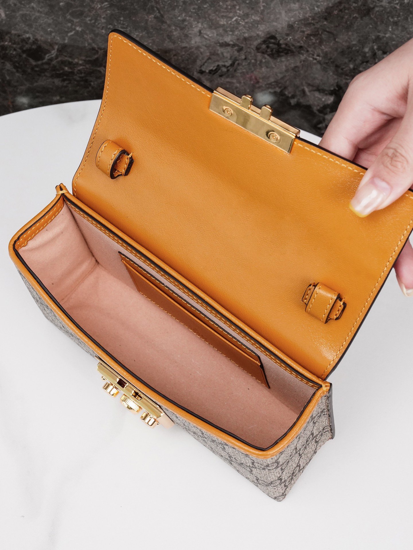 ๐๐š๐๐ฅ๐จ๐œ๐ค Collection of mini handbags Handbags Withdrawal White nnPadlock collection introduces a new mini handbags, the use of colorful leather and canvas materials to create a great look. The new mini handbag from the Padlock collection features a colorful mix of leather and canvas for a striking look. Crafted in the brand’s distinctive double G monogrammed canvas, the bag features a white leather upper body with the collection’s signature lock detail. A warm yellow leather shoulder strap and carry handle add eye-catching contrasting details. The brand makes excellent use of different materials and color tones to create a fashionable mix and match design. nSize: 18*10*5cmnModel No.: 652683