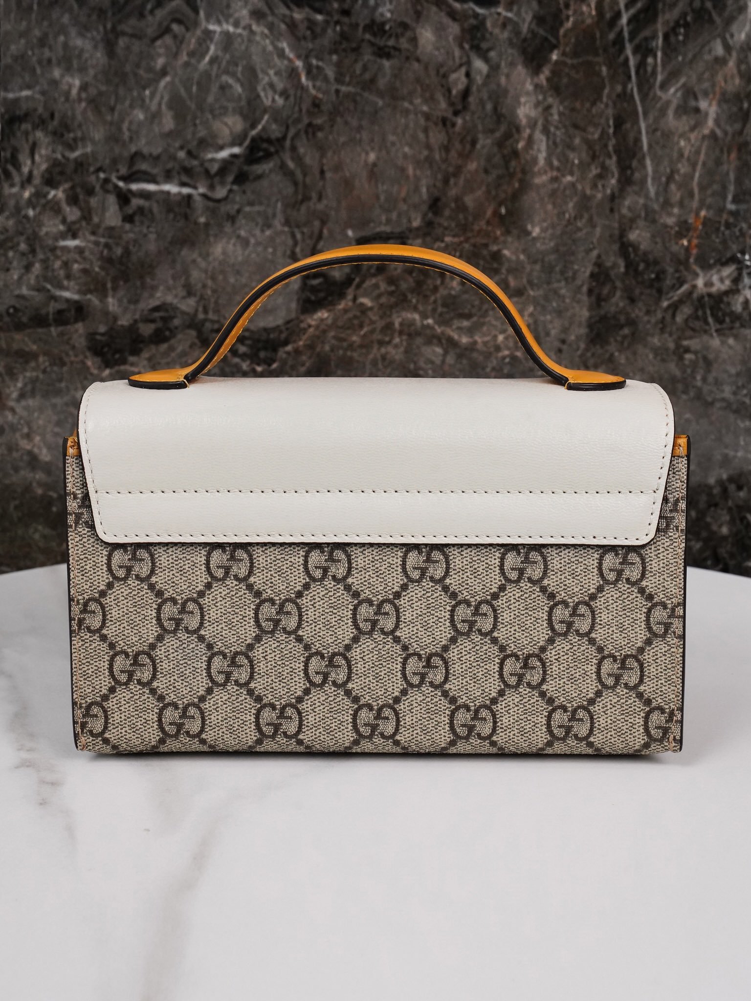 Padlock collection introduces a new mini handbags, the use of colorful leather and canvas materials to create a great look. The new mini handbag from the Padlock collection features a colorful mix of leather and canvas for a striking look. Crafted in the brand’s distinctive double G monogrammed canvas, the bag features a white leather upper body with the collection’s signature lock detail. A warm yellow leather shoulder strap and carry handle add eye-catching contrasting details. The brand makes excellent use of different materials and color tones to create a fashionable mix and match design.