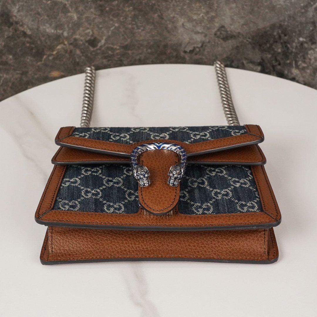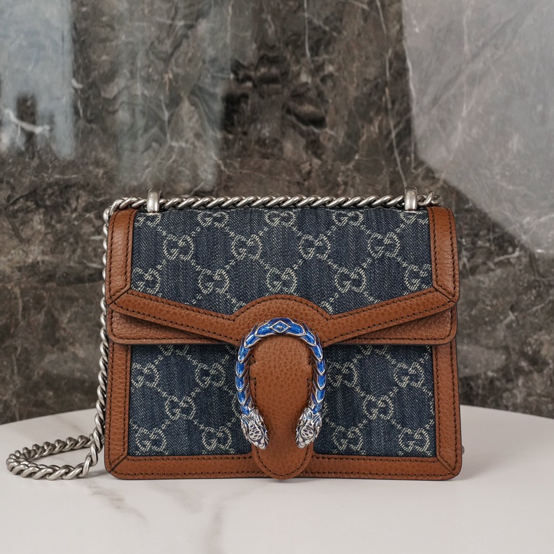 handbag continues the brand’s design philosophy of reinterpreting classic elements with a new take on the collection’s iconic tiger head closure, subtly incorporating bright blue enamel detailing that contrasts with the darker tones of the denim fabric. Contrasting leather piping adds glamor to the design