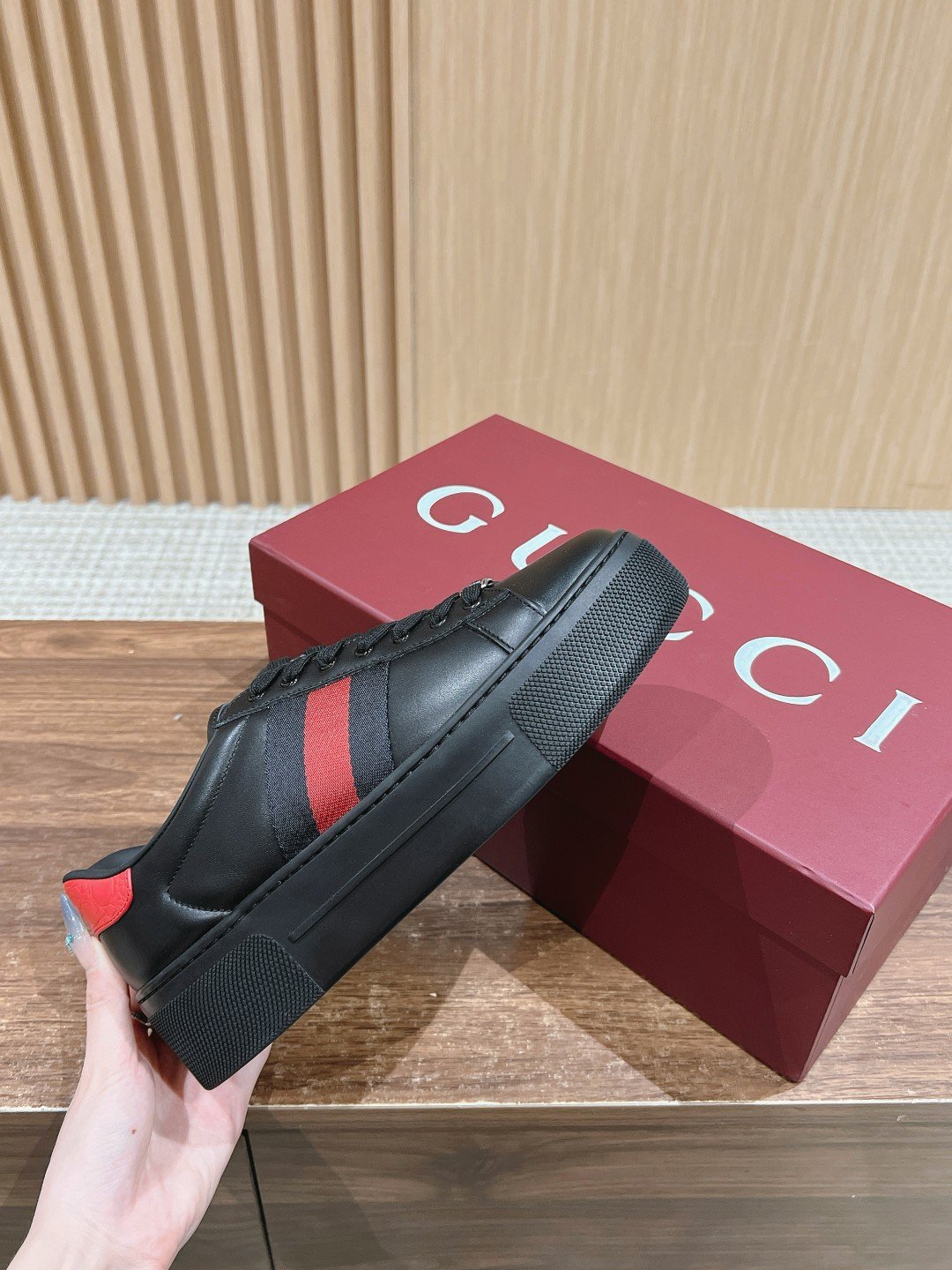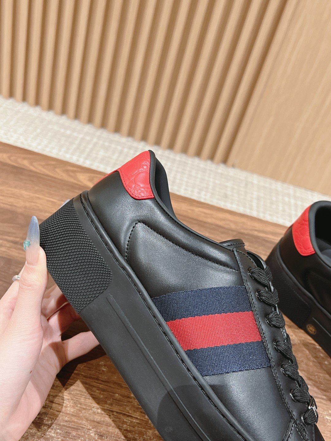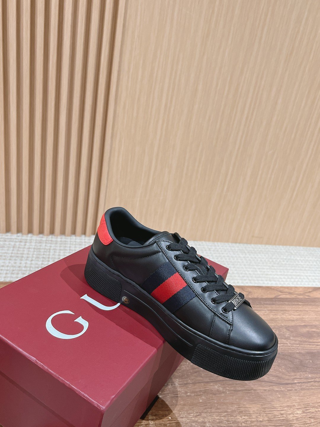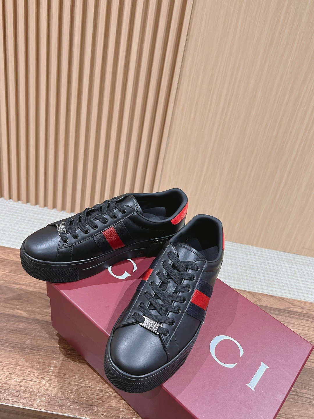 Ace Series of sneakers to continue the brand’s narrative, craftsmanship to achieve the main single product of the new series presents the characteristics of low-top design, with chic details, a new interpretation of the sneaker version of the lace-up fixation with “ACE” metal tag, thickening the structure of the exquisite molding of a sturdy shoe Gucci classic red and green stripes webbing makes the whole design more charming
