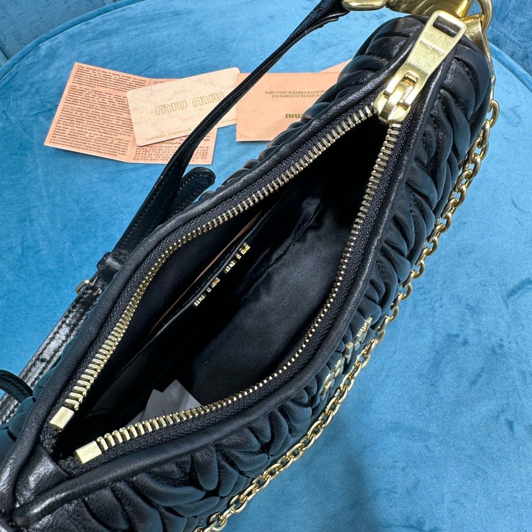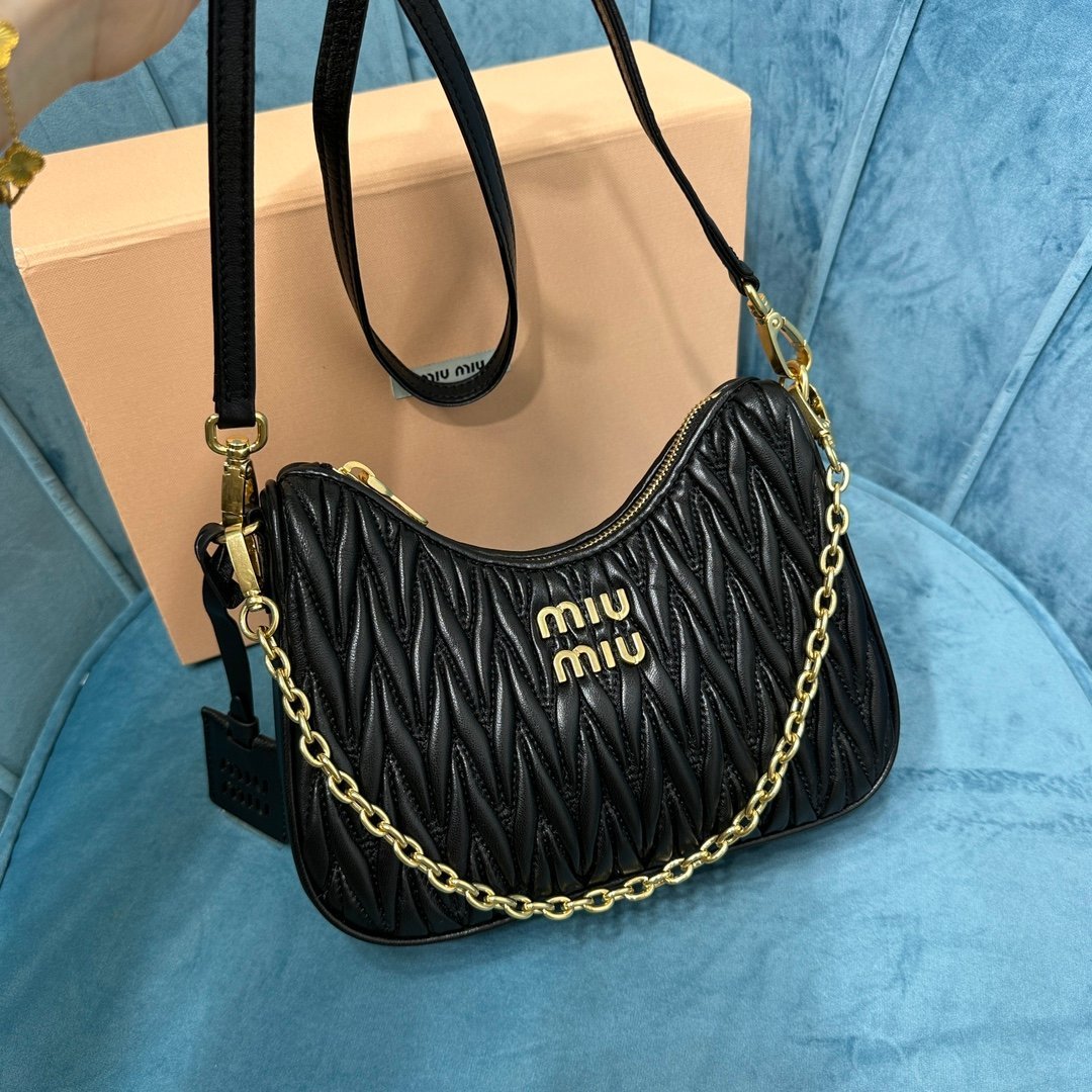 5BH211: new miumiu pleated chain bag! This new soft sheepskin shoulder bag picks up the exquisite Matelassé craftsmanship for a beautifully three-dimensional effect. The engraved logo is echoed in the different metal finishes of the metal fittings, emphasizing the iconic and recognizable style of the brand. Functionality and aesthetics are complemented by a detachable chain and leather shoulder strap, a Matelassé pattern, a detachable chain handle, a 105 cm detachable and adjustable leather shoulder strap, and a detachable leather cosmetic mirror case. Zipper closure, cotton satin lining! With dust bag! Size: 17 *20 *5cm. 1080089